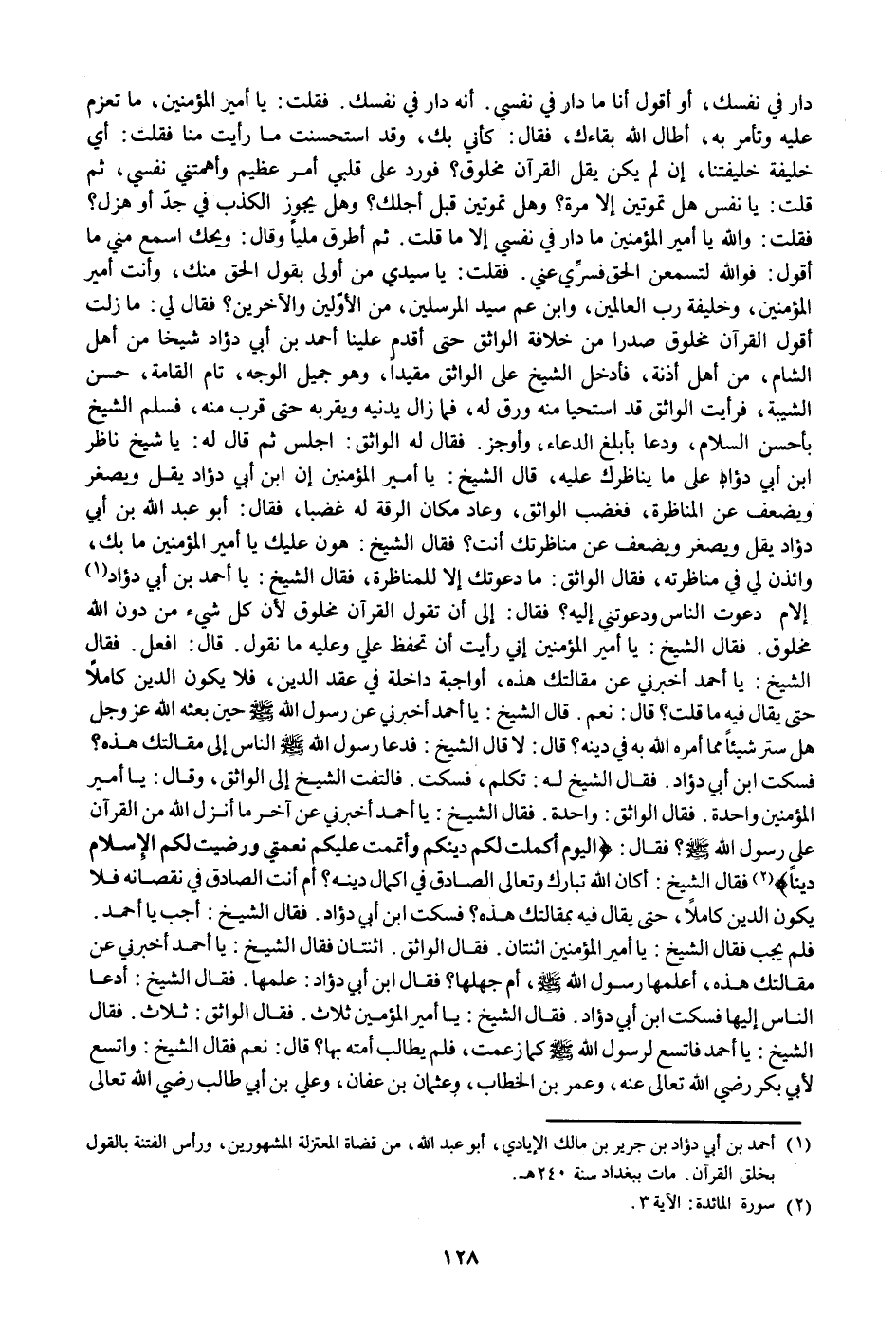 فسكت ابن أبي دؤاد. فقال الشيخ له: تكلم، فسكت. فالتفت الشيخ إلى الواثق، وقال: يا أمير المؤمنين واحدة. فقال الواثق: واحدة. فقال الشيخ: يا أحمد أخبرني عن آخر ما أنزل الله من القرآن على رسول الله صلى الله عليه وسلم؟ فقال: الْيَوْمَ أَكْمَلْتُ لَكُمْ دِينَكُمْ وَأَتْمَمْتُ عَلَيْكُمْ نِعْمَتِي وَرَضِيتُ لَكُمُ الْإِسْلامَ دِيناً