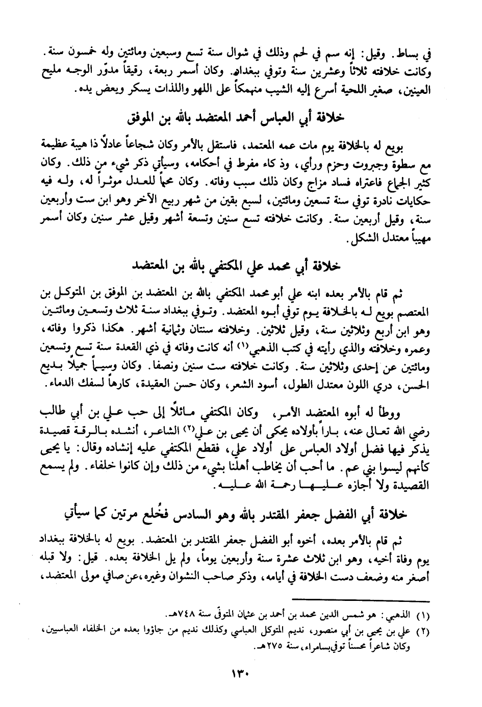 بويع له بالخلافة يوم مات عمه المعتمد، فاستقل بالأمر وكان شجاعا عادلا ذا هيبة عظيمة مع سطوة وجبروت وحزم ورأي، وذكاء مفرط في أحكامه، وسيأتي ذكر شيء من ذلك. وكان كثير الجماع فاعتراه فساد مزاج وكان ذلك سبب وفاته. وكان محيا للعدل موثرا له، وله فيه حكايات نادرة توفي سنة تسعين ومائتين، لسبع بقين من شهر ربيع الآخر وهو ابن ست وأربعين سنة، وقيل أربعين سنة. وكانت خلافته تسع سنين وتسعة أشهر وقيل عشر سنين وكان أسمر مهيبا معتدل الشكل.