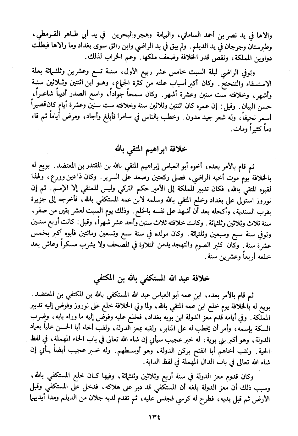 بويع له بالخلافة يوم خلع ابن عمه المتقي بالله، ولما ولي الخلافة خلع على نوروز وفوض إليه تدبير المملكة. وفي أيامه قدم معز الدولة ابن بويه بغداد، فخلع عليه وفوض إليه ما وراء بابه، وضرب السكة بإسمه، وأمر أن يخطب له على المنابر، ولقبه بمعز الدولة، ولقب أخاء أبا الحسن عليا بعماد الدولة، وهو أكبر بني بوية، له خبر عجيب سيأتي إن شاء الله تعالى في باب الحاء المهملة، في لفظ الحية. ولقب أخاهم أبا الفتح بركن الدولة، وهو أوسطهم. وله خبر عجيب أيضا يأتي إن شاء الله تعالى في باب الدال المهملة في لفظ الدابة.