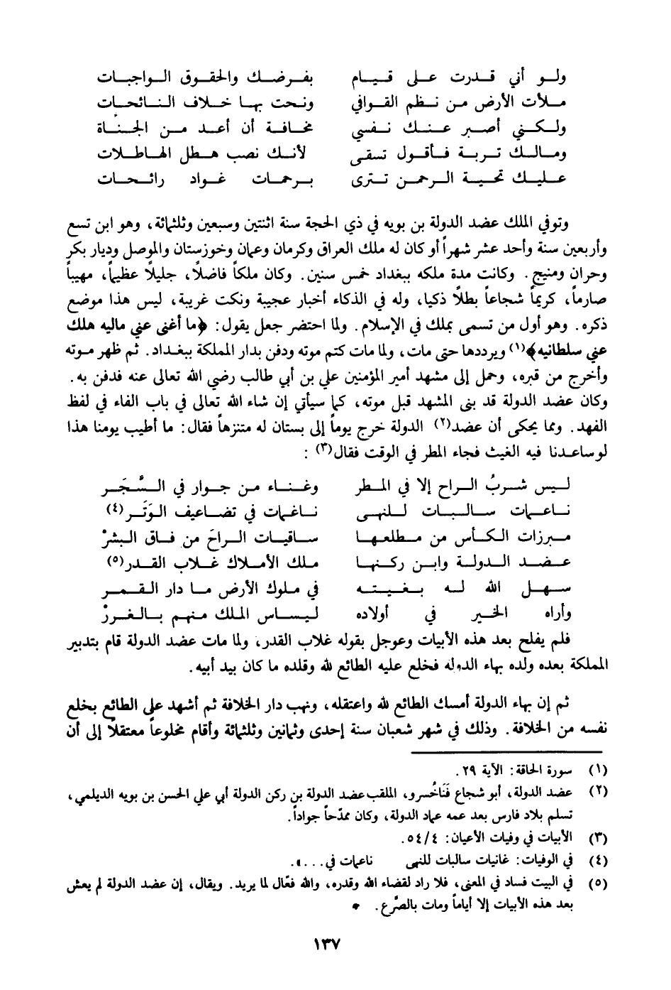 فلم يفلح بعد هذه الأبيات وعوجل بقوله غلاب القدر، ولما مات عضد الدولة قام بتدبير المملكة بعده ولده بهاء الدولة فخلع عليه الطائع لله وقلده ما كان بيد أبيه.