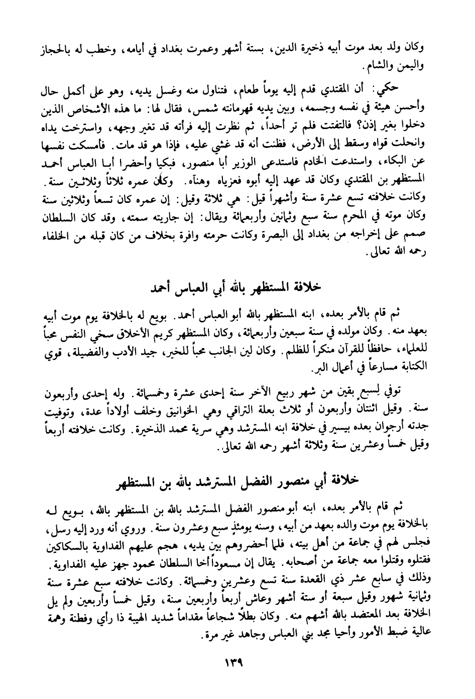 ثم قام بالأمر بعده، ابنه أبو منصور الفضل المسترشد بالله بن المستظهر بالله، بويع له بالخلافة يوم موت والده بعهد من أبيه، وسنه يومئذ سبع وعشرون سنة. وروي أنه ورد إليه رسل، فجلس لهم في جماعة من أهل بيته، فلما أحضروهم بين يديه، هجم عليهم الفداوية بالسكاكين فقتلوه وقتلوا معه جماعة من أصحابه. يقال إن مسعودا أخا السلطان محمود جهز عليه الفداوية.