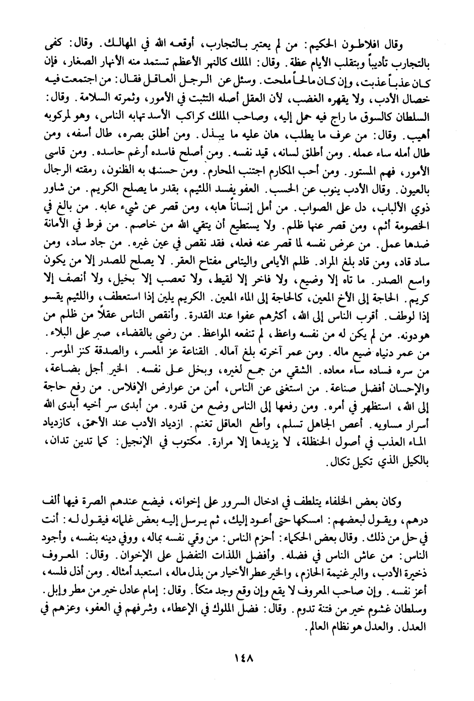 من سره فساده ساء معاده. الشقي من جمع لغيره، وبخل على نفسه. الخير أجل بضاعة، والإحسان أفضل صناعة. من استغنى عن الناس، أمن من عوارض الإفلاس. من رفع حاجة إلى الله، استظهر في أمره. ومن رفعها إلى الناس وضع من قدره. من أبدى سر أخيه أبدى الله أسرار مساويه. أعص الجاهل تسلم، وأطع العاقل تغنم. ازدياد الأدب عند الأحمق، كازدياد الماء العذب في أصول الحنظلة، لا يزيدها إلا مرارة. مكتوب في الإنجيل: كما تدين تدان، بالكيل الذي تكيل تكال.