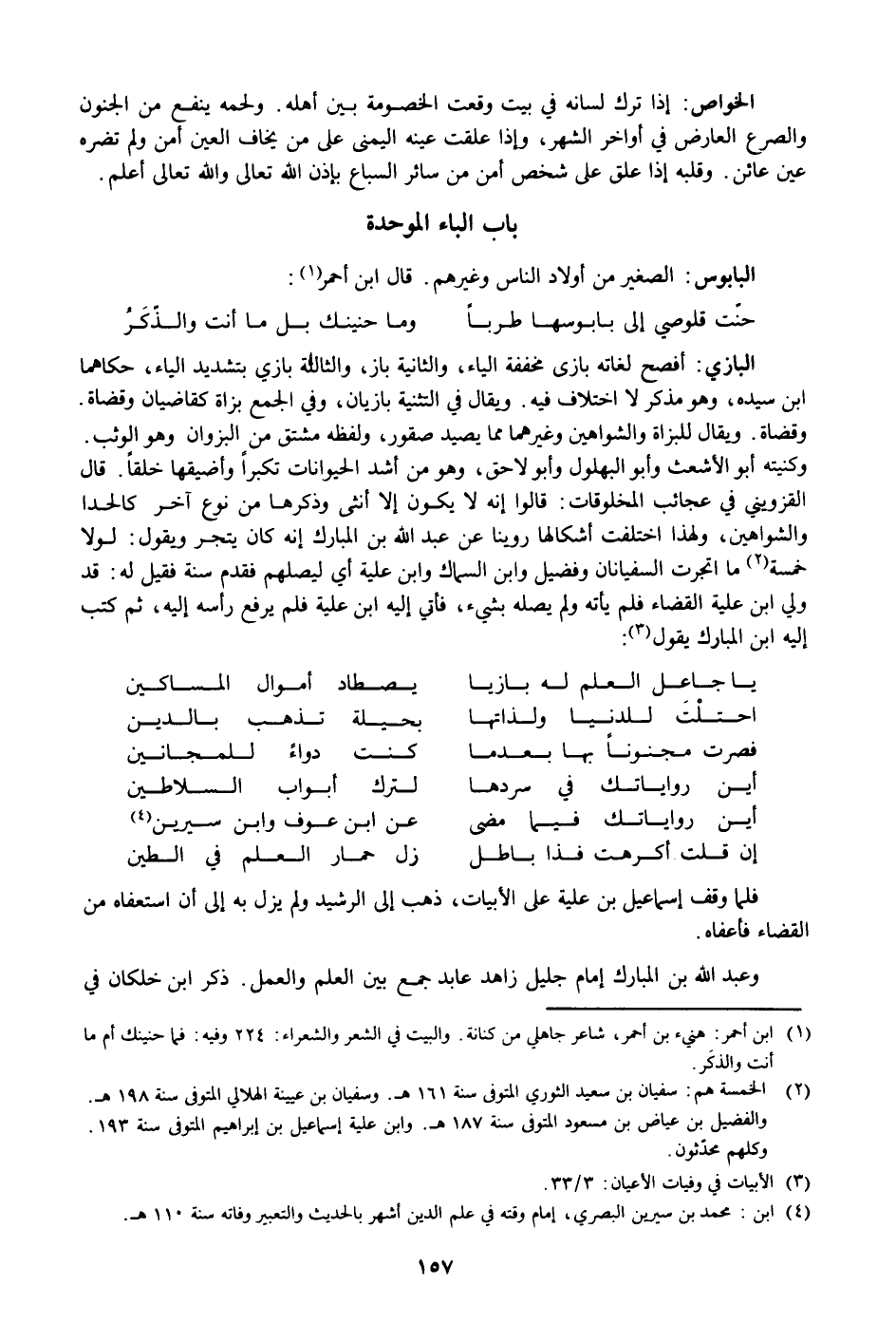 وكنيته أبو الأشعث وأبو البهلول وأبو لاحق، وهو من أشد الحيوانات تكبرا وأضيقها خلقا. قال القزويني في عجائب المخلوقات: قالوا إنه لا يكون إلا أنثى وذكرها من نوع آخر كالحدا والشواهين، ولهذا اختلفت أشكالها روينا عن عبد الله بن المبارك إنه كان يتجر ويقول: لولا خمسة «2» ما اتجرت السفيانان وفضيل وابن السماك وابن علية أي ليصلهم فقدم سنة فقيل له: قد ولي ابن علية القضاء فلم يأته ولم يصله بشيء، فأتي إليه ابن علية فلم يرفع رأسه إليه، ثم كتب إليه ابن المبارك يقول «3» :