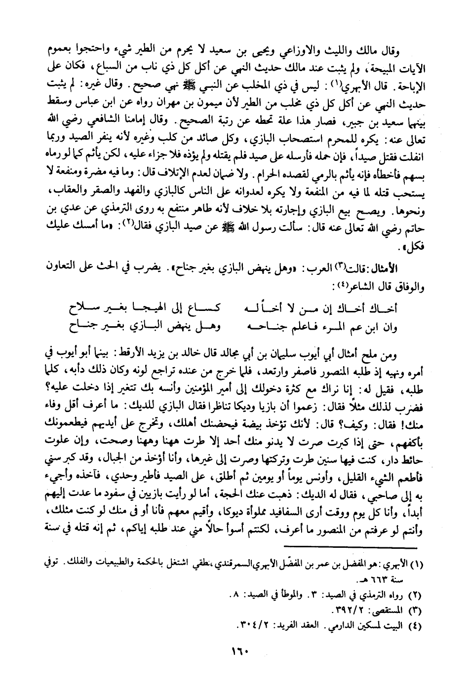 وقال مالك والليث والاوزاعي ويحيى بن سعيد لا يحرم من الطير شيء واحتجوا بعموم الآيات المبيحة، ولم يثبت عند مالك حديث النهي عن أكل كل ذي ناب من السباع، فكان على الإباحة. قال الأبهري «1» : ليس في ذي المخلب عن النبي صلى الله عليه وسلم نهي صحيح. وقال غيره: لم يثبت حديث النهي عن أكل كل ذي مخلب من الطير لأن ميمون بن مهران رواه عن ابن عباس وسقط بينهما سعيد بن جبير، فصار هذا علة تحطه عن رتبة الصحيح. وقال إمامنا الشافعي رضي الله تعالى عنه: يكره للمحرم استصحاب البازي، وكل صائد من كلب وغيره لأنه ينفر الصيد وربما انفلت فقتل صيدا، فإن حمله فأرسله على صيد فلم يقتله ولم يؤذه فلا جزاء عليه، لكن يأثم كما لو رماه بسهم فأخطأه فإنه يأثم بالرمي لقصده الحرام. ولا ضمان لعدم الإتلاف قال: وما فيه مضرة ومنفعة لا يستحب قتله لما فيه من المنفعة ولا يكره لعدوانه على الناس كالبازي والفهد والصقر والعقاب، ونحوها. ويصح بيع البازي وإجارته بلا خلاف لأنه طاهر منتفع به روى الترمذي عن عدي بن حاتم رضي الله تعالى عنه قال: سألت رسول الله صلى الله عليه وسلم عن صيد البازي فقال «2» : «ما أمسك عليك فكل» .