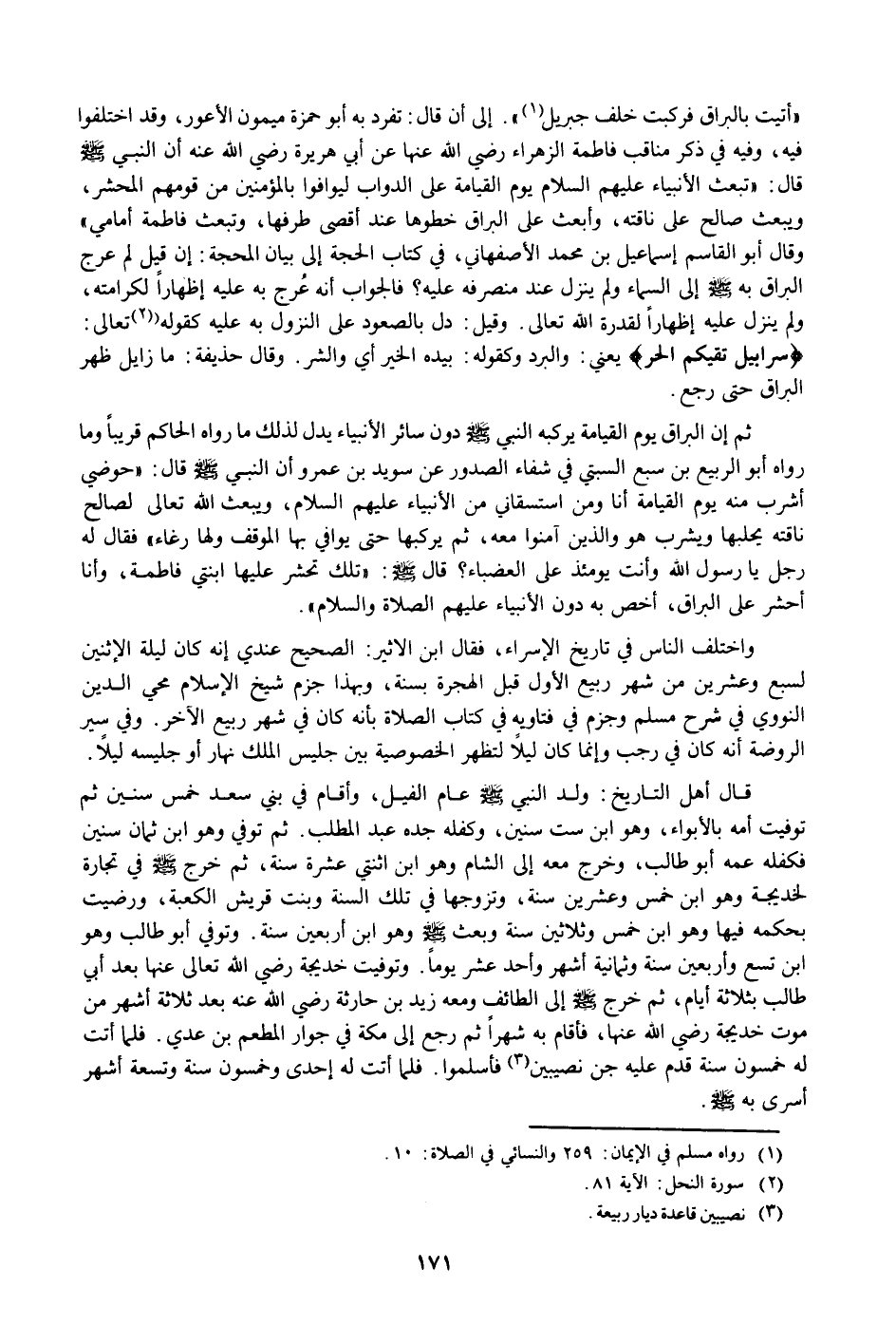 قال أهل التاريخ: ولد النبي صلى الله عليه وسلم عام الفيل، وأقام في بني سعد خمس سنين ثم توفيت أمه بالأبواء، وهو ابن ست سنين، وكفله جده عبد المطلب. ثم توفي وهو ابن ثمان سنين فكفله عمه أبو طالب، وخرج معه إلى الشام وهو ابن اثنتي عشرة سنة، ثم خرج صلى الله عليه وسلم في تجارة لخديجة وهو ابن خمس وعشرين سنة، وتزوجها في تلك السنة وبنت قريش الكعبة، ورضيت بحكمه فيها وهو ابن خمس وثلاثين سنة وبعث صلى الله عليه وسلم وهو ابن أربعين سنة. وتوفي أبو طالب وهو ابن تسع وأربعين سنة وثمانية أشهر وأحد عشر يوما. وتوفيت خديجة رضي الله تعالى عنها بعد أبي طالب بثلاثة أيام، ثم خرج صلى الله عليه وسلم إلى الطائف ومعه زيد بن حارثة رضي الله عنه بعد ثلاثة أشهر من موت خديجة رضي الله عنها، فأقام به شهرا ثم رجع إلى مكة في جوار المطعم بن عدي. فلما أتت له خمسون سنة قدم عليه جن نصيبين «3» فأسلموا. فلما أتت له إحدى وخمسون سنة وتسعة أشهر أسرى به صلى الله عليه وسلم.
