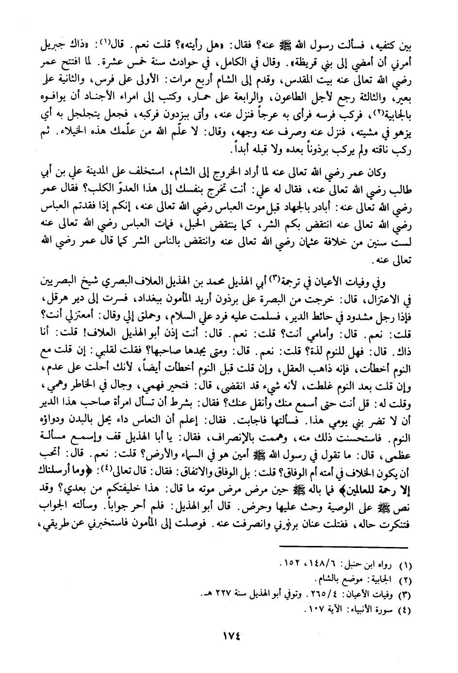 قلت: نعم. قال: وأمامي أنت؟ قلت: نعم. قال: أنت إذن أبو الهذيل العلاف! قلت: أنا ذاك. قال: فهل للنوم لذة؟ قلت: نعم. قال: ومتى يجدها صاحبها؟ فقلت لقلبي: إن قلت مع النوم أخطأت، فإنه ذاهب العقل، وإن قلت قبل النوم أخطأت أيضا، لأنك أحلت على عدم، وإن قلت بعد النوم غلطت، لأنه شيء قد انقضى، قال: فتحير فهمي، وجال في الخاطر وهمي، وقلت له: قل أنت حتى أسمع منك وأنقل عنك؟ فقال: بشرط أن تسأل امرأة صاحب هذا الدير أن لا تضر بني يومي هذا. فسألتها فاجابت. فقال: إعلم أن النعاس داء يحل بالبدن ودواؤه النوم. فاستحسنت ذلك منه، وهممت بالإنصراف، فقال: يا أبا الهذيل قف وإسمع مسألة عظمى، قال: ما تقول في رسول الله صلى الله عليه وسلم أمين هو في السماء والأرض؟ قلت: نعم. قال: أتحب أن يكون الخلاف في أمته أم الوفاق؟ قلت: بل الوفاق والاتفاق: فقال: قال تعالى «4» : وَما أَرْسَلْناكَ إِلَّا رَحْمَةً لِلْعالَمِينَ