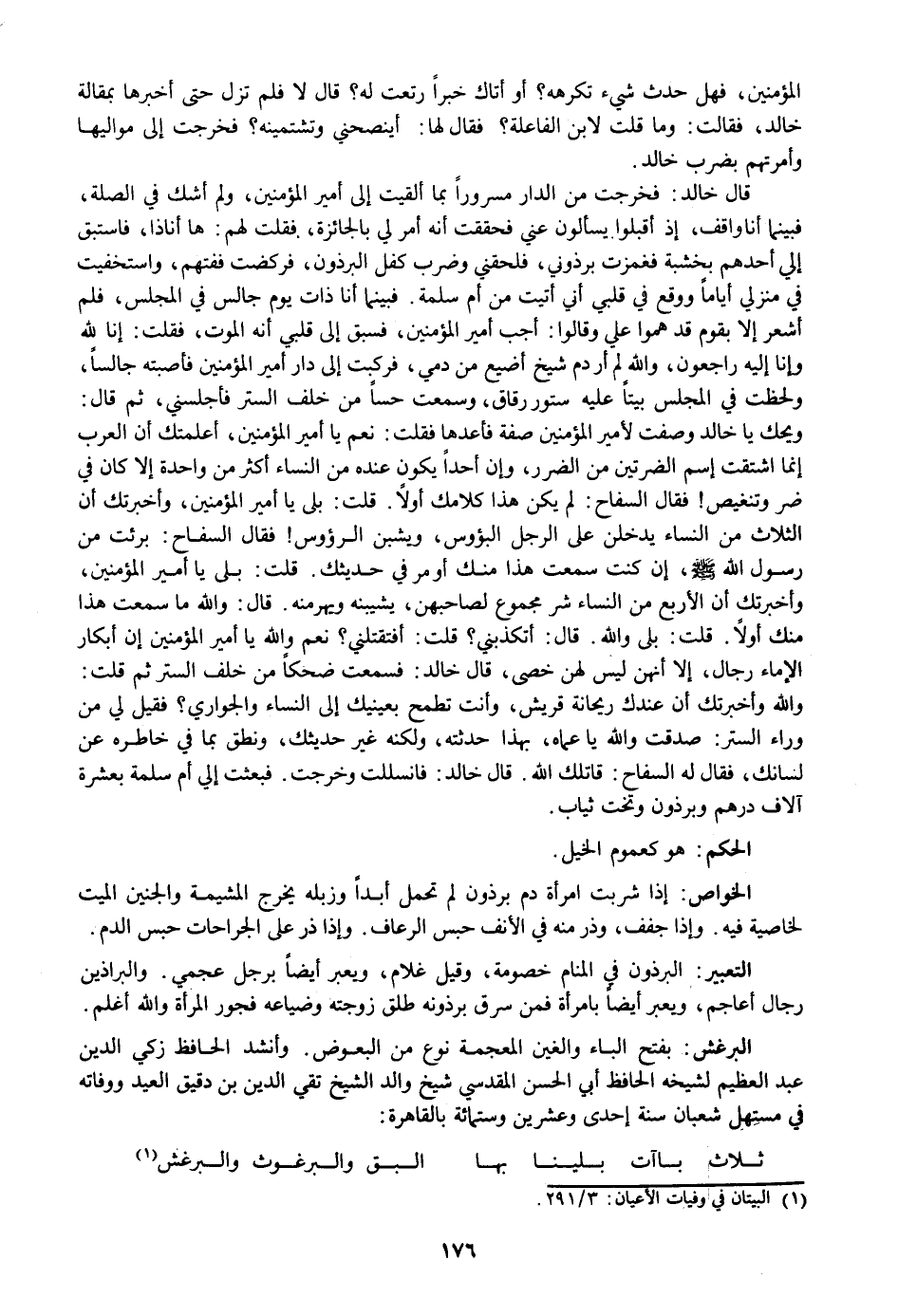 ويحك يا خالد وصفت لأمير المؤمنين صفة فأعدها فقلت: نعم يا أمير المؤمنين، أعلمتك أن العرب إنما اشتقت إسم الضرتين من الضرر، وإن أحدا يكون عنده من النساء أكثر من واحدة إلا كان في ضر وتنغيص! فقال السفاح: لم يكن هذا كلامك أولا. قلت: بلى يا أمير المؤمنين، وأخبرتك أن الثلاث من النساء يدخلن على الرجل البؤوس، ويشبن الرؤوس! فقال السفاح: برئت من رسول الله صلى الله عليه وسلم، إن كنت سمعت هذا منك أو مر في حديثك. قلت: بلى يا أمير المؤمنين، وأخبرتك أن الأربع من النساء شر مجموع لصاحبهن، يشيبنه ويهرمنه. قال: والله ما سمعت هذا منك أولا. قلت: بلى والله. قال: أتكذبني؟ قلت: أفتقتلني؟ نعم والله يا أمير المؤمنين إن أبكار الإماء رجال، إلا أنهن ليس لهن خصى، قال خالد: فسمعت ضحكا من خلف الستر ثم قلت: