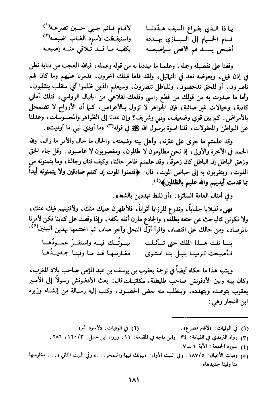 وقفنا على تفصيله وجمله، وعلمنا ما تهددنا به من قوله وعمله، فيالله العجب من ذبابة تطن في إذن فيل، وبعوضه تعد في التماثيل، ولقد قالها قبلك آخرون، فدمرنا عليهم وما كان لهم ناصرون، أو للحق تدحضون، وللباطل تنصرون، وسيعلم الذين ظلموا أي منقلب ينقلبون، وأما ما صدرت به من قولك من قطع راسي وقلعك لقلاعي من الجبال الرواسي، فتلك أماني كاذبة، وخيالات غير صائبة، فإن الجواهر لا تزول بالأعراض، كما أن الأرواح لا تضمحل بالأمراض. كم بين قوي وضعيف، ودني وشريف؟ وإن عدنا إلى الظواهر والمحسوسات، وعدلنا عن البواطن والمعقولات، قلنا اسوة برسول الله صلى الله عليه وسلم في قوله «3» «ما أوذي نبي ما أوذيت» .
