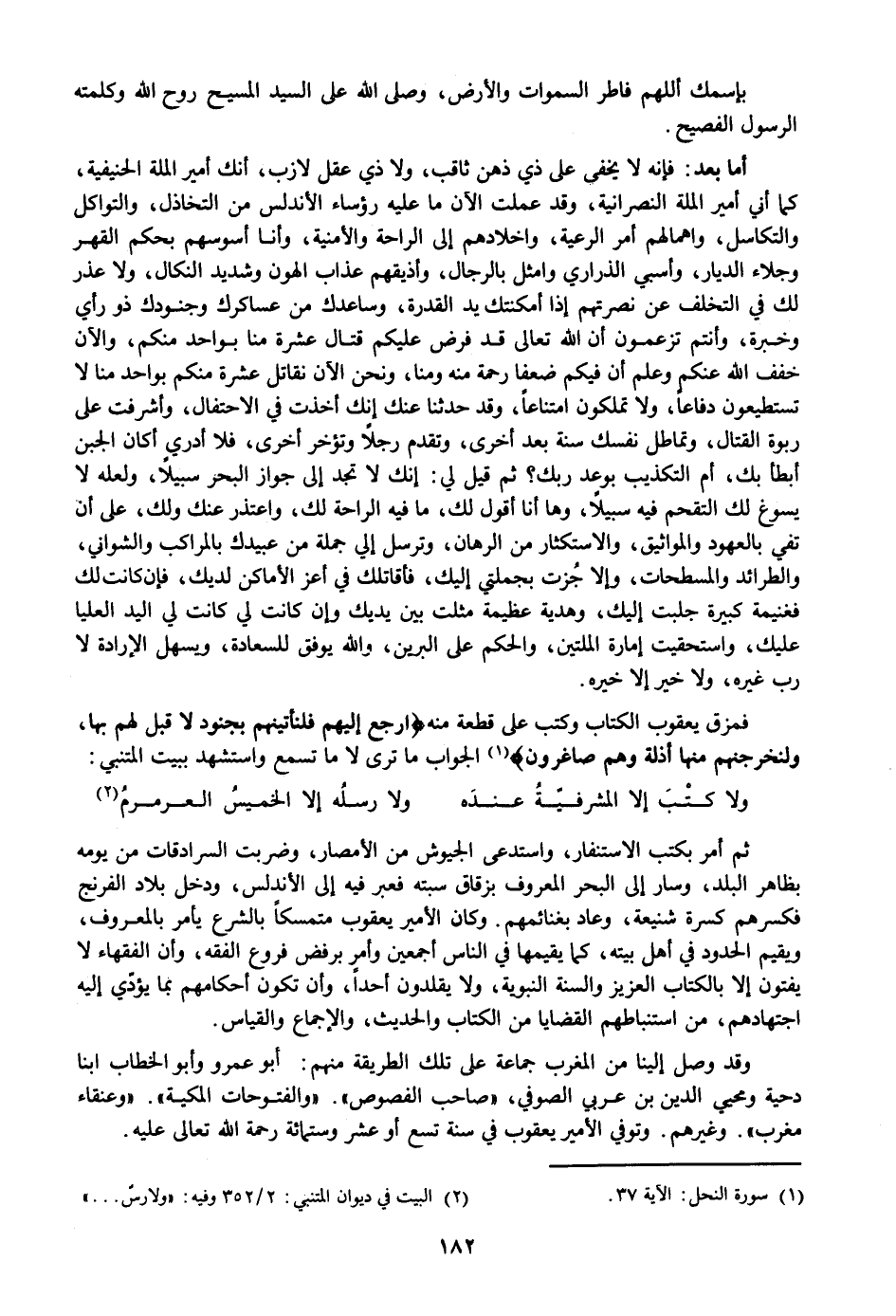 أما بعد: فإنه لا يخفى على ذي ذهن ثاقب، ولا ذي عقل لازب، أنك أمير الملة الحنيفية، كما أني أمير الملة النصرانية، وقد عملت الآن ما عليه رؤساء الأندلس من التخاذل، والتواكل والتكاسل، واهمالهم أمر الرعية، واخلادهم إلى الراحة والأمنية، وأنا أسوسهم بحكم القهر وجلاء الديار، وأسبي الذراري وامثل بالرجال، وأذيقهم عذاب الهون وشديد النكال، ولا عذر لك في التخلف عن نصرتهم إذا أمكنتك يد القدرة، وساعدك من عساكرك وجنودك ذو رأي وخبرة، وأنتم تزعمون أن الله تعالى قد فرض عليكم قتال عشرة منا بواحد منكم، والآن خفف الله عنكم وعلم أن فيكم ضعفا رحمة منه ومنا، ونحن الآن نقاتل عشرة منكم بواحد منا لا تستطيعون دفاعا، ولا تملكون امتناعا، وقد حدثنا عنك إنك أخذت في الاحتفال، وأشرفت على ربوة القتال، وتماطل نفسك سنة بعد أخرى، وتقدم رجلا وتؤخر أخرى، فلا أدري أكان الجبن أبطأ بك، أم التكذيب بوعد ربك؟ ثم قيل لي: إنك لا تجد إلى جواز البحر سبيلا، ولعله لا يسوغ لك التقحم فيه سبيلا، وها أنا أقول لك، ما فيه الراحة لك، واعتذر عنك ولك، على أن تفي بالعهود والمواثيق، والاستكثار من الرهان، وترسل إلي جملة من عبيدك بالمراكب والشواني، والطرائد والمسطحات، وإلا جزت بجملتي إليك، فأقاتلك في أعز الأماكن لديك، فإن كانت لك فغنيمة كبيرة جلبت إليك، وهدية عظيمة مثلت بين يديك وإن كانت لي كانت لي اليد العليا عليك، واستحقيت إمارة الملتين، والحكم على البرين، والله يوفق للسعادة، ويسهل الإرادة لا رب غيره، ولا خير إلا خيره.