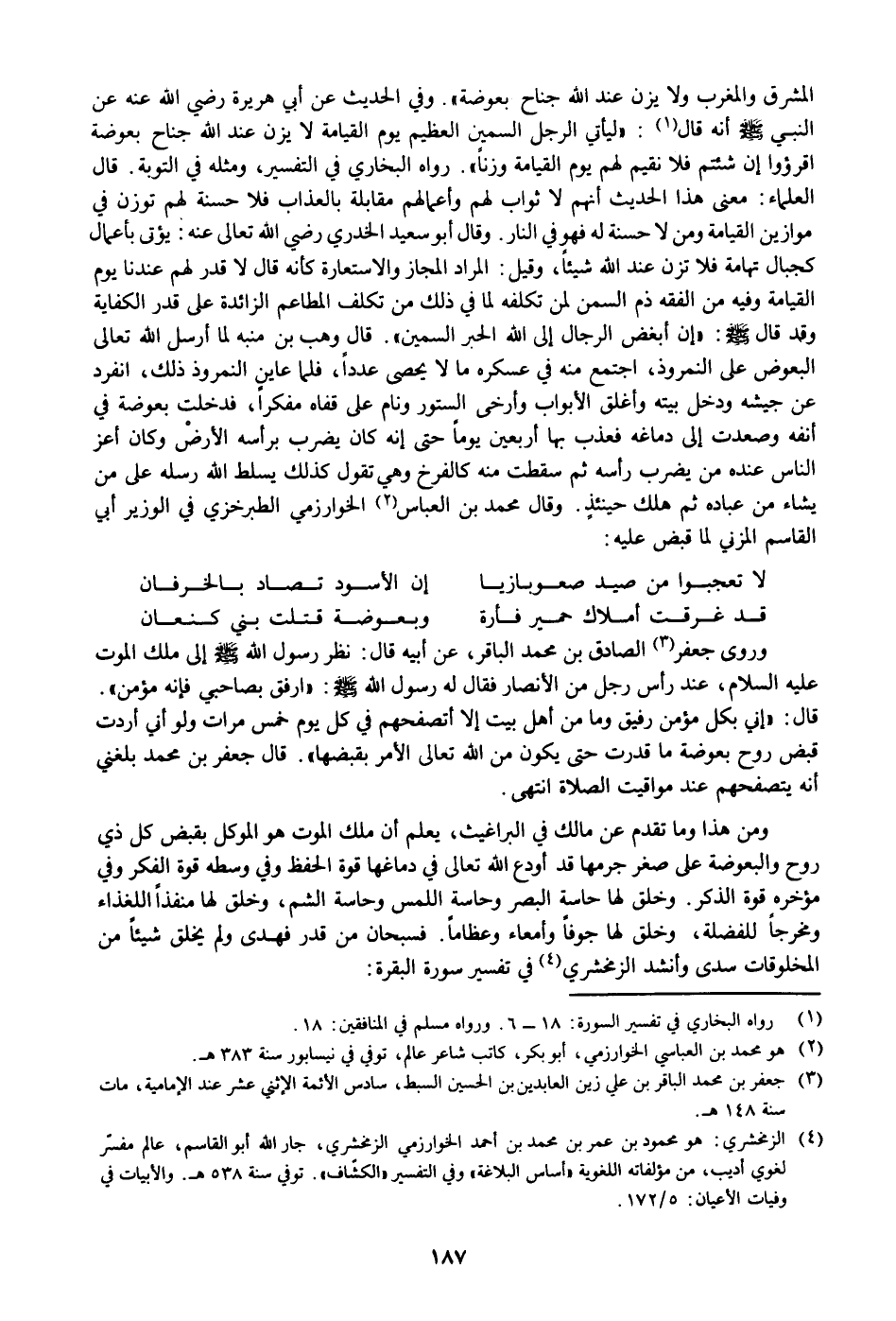 وروى جعفر «3» الصادق بن محمد الباقر، عن أبيه قال: نظر رسول الله صلى الله عليه وسلم إلى ملك الموت عليه السلام، عند رأس رجل من الأنصار فقال له رسول الله صلى الله عليه وسلم: «ارفق بصاحبي فإنه مؤمن» .