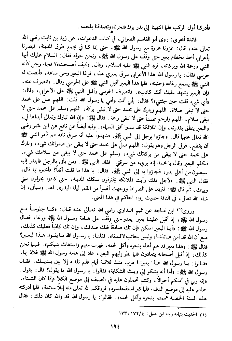 فتكلم البعير وقال يا محمد إنه بريء من سرقتي. فقال النبي صلى الله عليه وسلم: «من يأتي بالرجل فابتدر إليه سبعون من أهل بدر، فجاؤوا به إلى النبي صلى الله عليه وسلم، فقال: يا هذا ما قلت آنفا؟ فأخبره بما قال، فقال النبي صلى الله عليه وسلم: «لأجل ذلك رأيت الملائكة يخترقون سكك المدينة، حتى كادوا يحولون بيني وبينك، ثم قال صلى الله عليه وسلم: لتردن على الصراط ووجهك أضوأ من القمر ليلة البدر» . اه-. وسيأتي، إن شاء الله تعالى، في الناقة حديث رواه الحاكم في هذا المعنى.