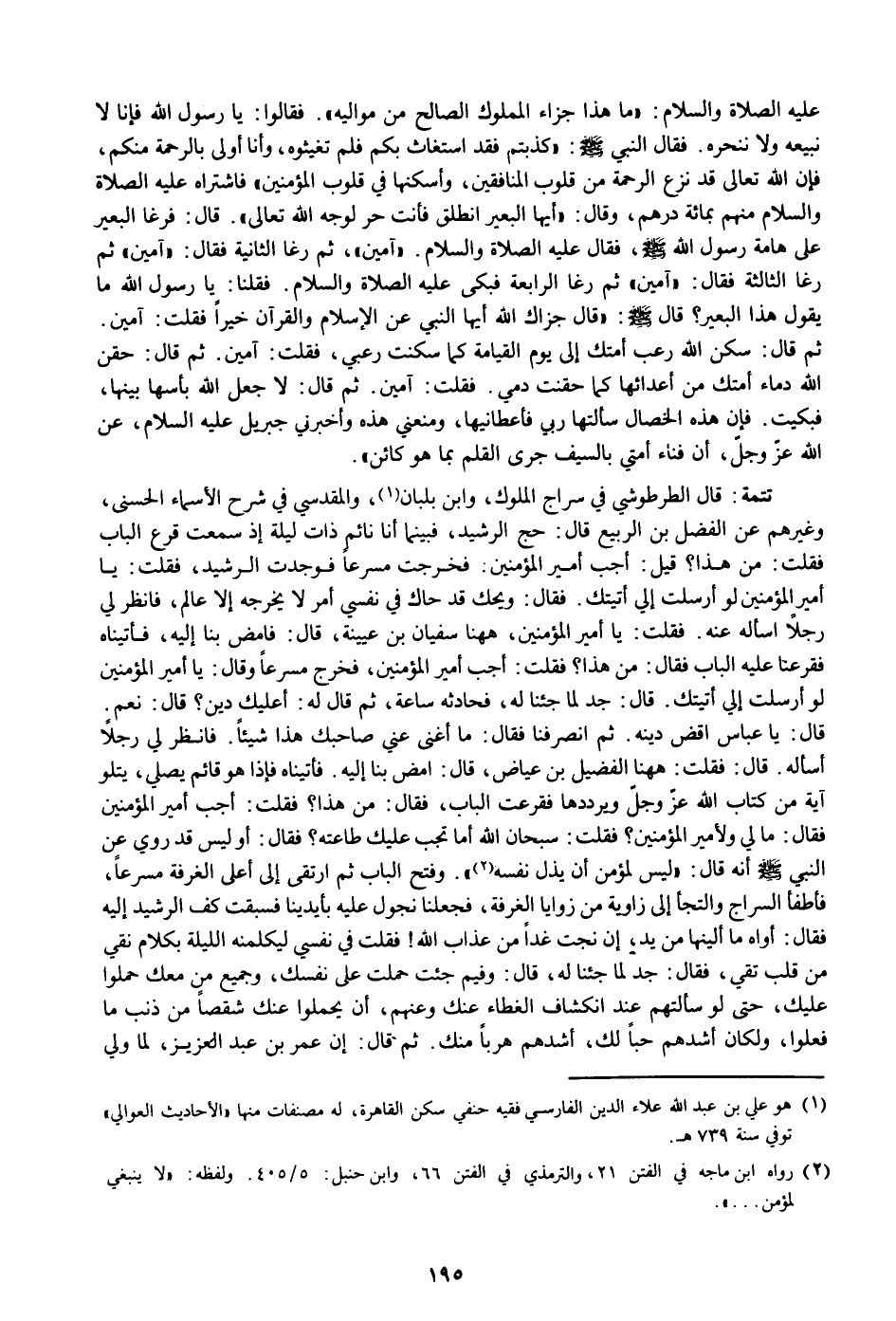 قال الطرطوشي في سراج الملوك، وابن بلبان «1» ، والمقدسي في شرح الأسماء الحسنى، وغيرهم عن الفضل بن الربيع قال: حج الرشيد، فبينما أنا نائم ذات ليلة إذ سمعت قرع الباب فقلت: من هذا؟ قيل: أجب أمير المؤمنين: فخرجت مسرعا فوجدت الرشيد، فقلت: يا أمير المؤمنين لو أرسلت إلي أتيتك. فقال: ويحك قد حاك في نفسي أمر لا يخرجه إلا عالم، فانظر لي رجلا اسأله عنه. فقلت: يا أمير المؤمنين، ههنا سفيان بن عيينة، قال: فامض بنا إليه، فأتيناه فقرعنا عليه الباب فقال: من هذا؟ فقلت: أجب أمير المؤمنين، فخرج مسرعا وقال: يا أمير المؤمنين لو أرسلت إلي أتيتك. قال: جد لما جئنا له، فحادثه ساعة، ثم قال له: أعليك دين؟ قال: نعم.