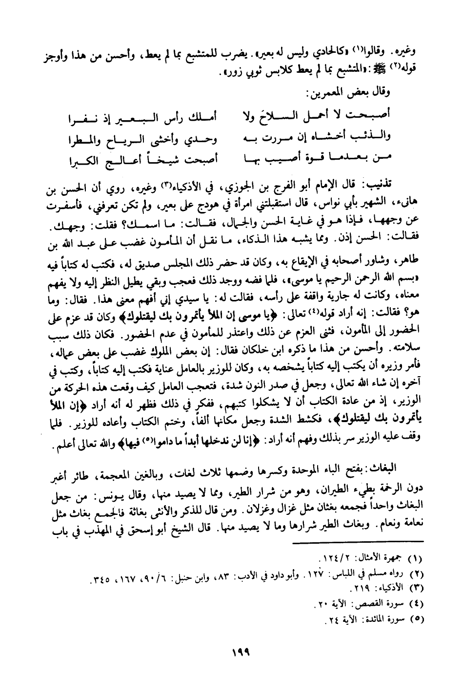 فقالت: الحسن إذن. ومما يشبه هذا الذكاء، ما نقل أن المأمون غضب على عبد الله بن طاهر، وشاور أصحابه في الإيقاع به، وكان قد حضر ذلك المجلس صديق له، فكتب له كتابا فيه «بسم الله الرحمن الرحيم يا موسى» ، فلما فضه ووجد ذلك فعجب وبقي يطيل النظر إليه ولا يفهم معناه، وكانت له جارية واقفة على رأسه، فقالت له: يا سيدي إني أفهم معنى هذا. فقال: وما هو؟ فقالت: إنه أراد قوله «4» تعالى: يا مُوسى إِنَّ الْمَلَأَ يَأْتَمِرُونَ بِكَ لِيَقْتُلُوكَ