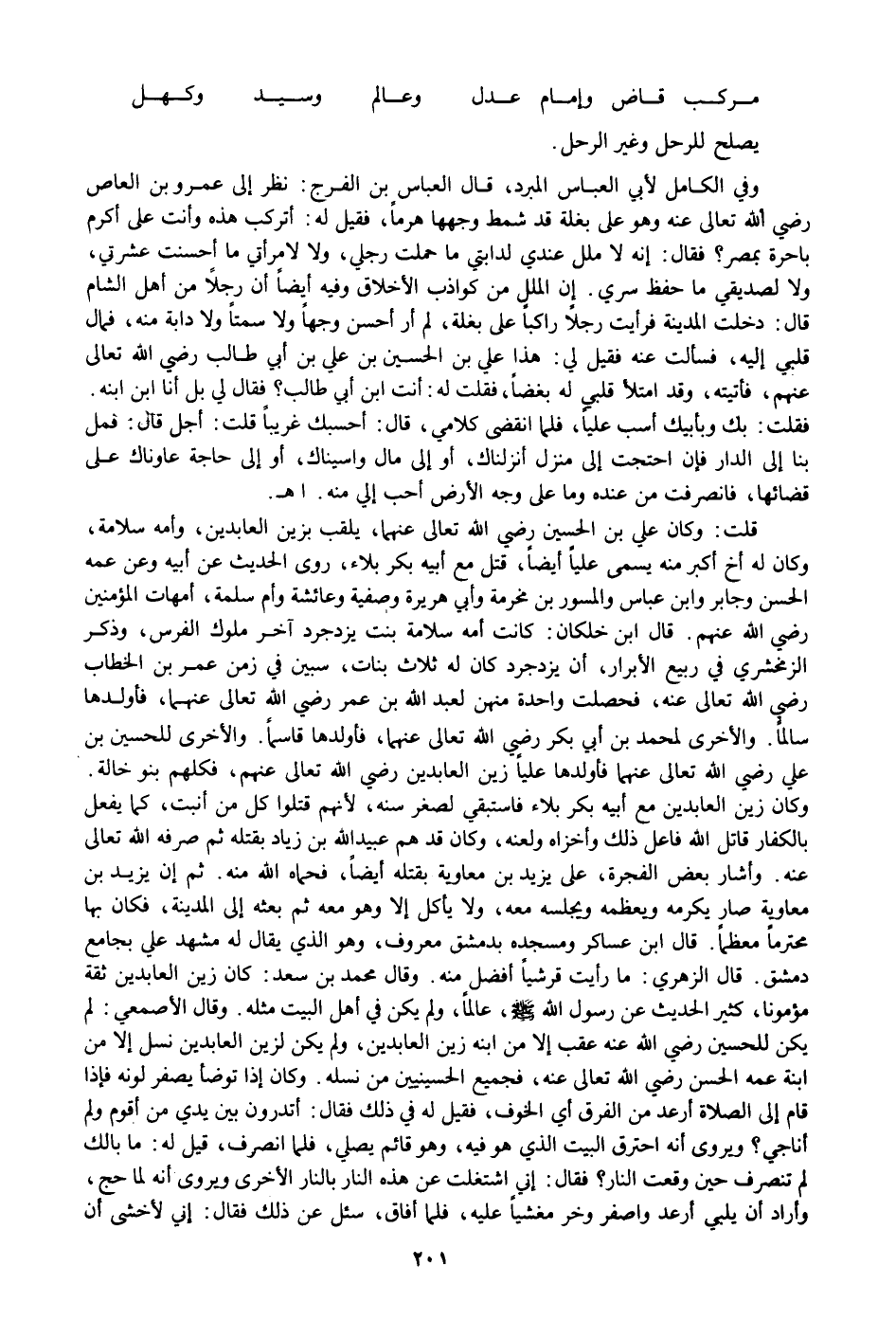وفي الكامل لأبي العباس المبرد، قال العباس بن الفرج: نظر إلى عمرو بن العاص رضي الله تعالى عنه وهو على بغلة قد شمط وجهها هرما، فقيل له: أتركب هذه وأنت على أكرم باحرة بمصر؟ فقال: إنه لا ملل عندي لدابتي ما حملت رجلي، ولا لامرأتي ما أحسنت عشرتي، ولا لصديقي ما حفظ سري. إن الملل من كواذب الأخلاق وفيه أيضا أن رجلا من أهل الشام قال: دخلت المدينة فرأيت رجلا راكبا على بغلة، لم أر أحسن وجها ولا سمتا ولا دابة منه، فمال قلبي إليه، فسألت عنه فقيل لي: هذا علي بن الحسين بن علي بن أبي طالب رضي الله تعالى عنهم، فأتيته، وقد امتلأ قلبي له بغضا، فقلت له: أنت ابن أبي طالب؟ فقال لي بل أنا ابن ابنه.