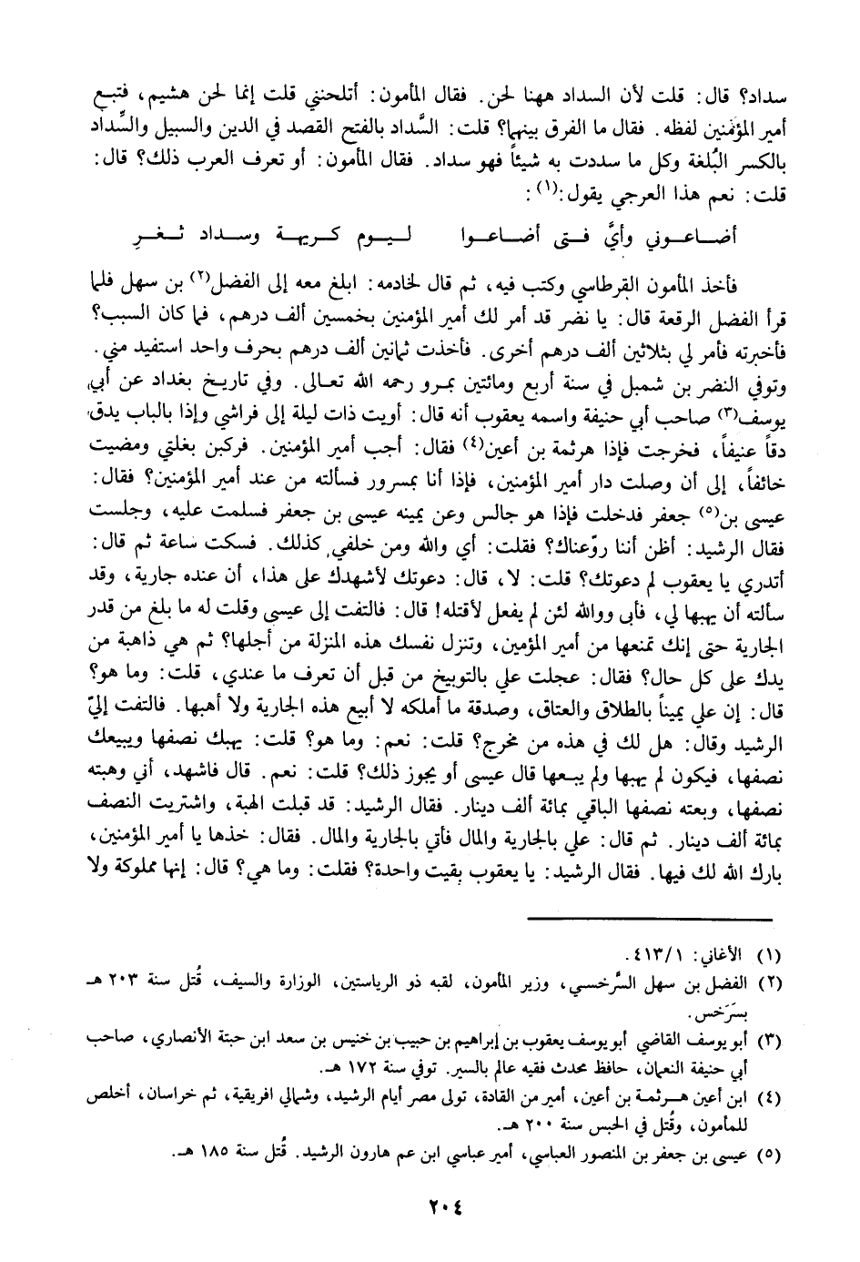 وتوفي النضر بن شمبل في سنة أربع ومائتين بمرو رحمه الله تعالى. وفي تاريخ بغداد عن أبي يوسف «3» صاحب أبي حنيفة واسمه يعقوب أنه قال: أويت ذات ليلة إلى فراشي وإذا بالباب يدق دقا عنيفا، فخرجت فإذا هرثمة بن أعين «4» فقال: أجب أمير المؤمنين. فركبن بغلتي ومضيت خائفا، إلى أن وصلت دار أمير المؤمنين، فإذا أنا بمسرور فسألته من عند أمير المؤمنين؟ فقال: