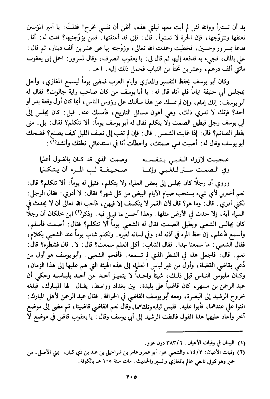 وكان أبو يوسف يحفظ التفسير والمغازي وأيام العرب فمضى يوما ليسمع المغازي، وأخل بمجلس أبي حنيفة اياما فلما أتاه قال له: يا أبا يوسف من كان صاحب راية جالوت؟ فقال له أبو يوسف: إنك إمام، وإن لم تمسك عن هذا سألتك على رؤوس الناس، أيما كان أول وقعة بدر أو أحد؟ فإنك لا تدري ذلك، وهي أهون مسائل التاريخ، فأمسك عنه. قيل: كان يجلس إلى أبي يوسف رجل فيطيل الصمت ولا يتكلم فقال له أبو يوسف يوما: ألا تتكلم؟ فقال: بلى. متى يفطر الصائم؟ قال: إذا غابت الشمس. قال: فإن لم تغب إلى نصف الليل كيف يصنع؟ فضحك أبو يوسف وقال له: أصبت في صمتك، وأخطأت أنا في استدعائي نطقك وأنشد «1» :