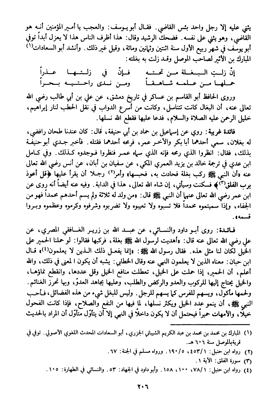 روي عن إسماعيل بن حماد بن أبي حنيفة، قال: كان عندنا طحان رافضي، له بغلان، سمي أحدهما أبا بكر والآخر عمر، فرمحه أحدهما فقتله. فأخبر جدي أبو حنيفة بذلك، فقال: انظروا الذي رمحه فإنه الذي سماه عمر فنظروا فوجدوه كذلك. وفي كامل ابن عدي في ترجمة خالد بن يزيد العمري المكي، عن سفيان بن أبان، عن أنس رضي الله تعالى عنه «أن النبي صلى الله عليه وسلم ركب بغلة فحادت به، فحبسها» وأمر «2» رجلا أن يقرأ عليها قُلْ أَعُوذُ بِرَبِّ الْفَلَقِ «3»