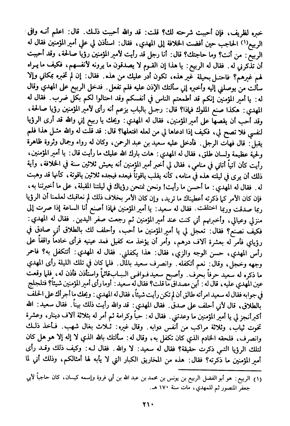 فكيف نصنع؟ فقال: تعجل لي يا أمير المؤمنين ما أحب، وأحلف لك بالطلاق أني صادق في رؤياي فأمر له بعشرة آلاف درهم، وأمر أن يؤخذ منه كفيل فمد عينيه فرأى خادما واقفا على رأس المهدي، حسن الوجه والزي، فقال: هذا يكفلني. فقال له المهدي: أتتكفل به؟ فاحمر وجهه وخجل، وقال: نعم أتكفله. وانصرف سعيد بالمال. فلما كان في تلك الليلة رأى المهدي ما ذكره له سعيد حرفا بحرف. وأصبح سعيد فوافى الباب قائما واستأذن فأذن له، فلما وقعت عين المهدي عليه، قال له: أين مصداق ما قلت؟ فقال له سعيد: أو ما رأى أمير المؤمنين شيئا؟ فتلجلج في جوابه فقال له سعيد امرأته طالق أن لم تكن رأيت شيئا، فقال له المهدي: ويحك ما أجرأك على الحلف بالطلاق، قال لأني أحلف على صدق. فقال المهدي: قد والله رأيت ذلك بينا. فقال سعيد: الله أكبر أنجز لي يا أمير المؤمنين ما وعدتني. فقال له: حبا وكرامة ثم أمر له بثلاثة آلاف دينار، وعشرة تخوت ثياب، وثلاثة مراكب من أنفس دوابه. وقال غيره: ثلاث بغال شهب. فأخذ ذلك وانصرف، فلحقه الخادم الذي كان تكفل به، وقال له: سألتك بالله الذي لا إله إلا هو هل كان لتلك الرؤيا التي ذكرت حقيقة؟ فقال له سعيد: لا والله. فقال له: وكيف ذلك وقد رأى أمير المؤمنين ما ذكرته؟ فقال: هذه من المخاريق الكبار التي لا يأبه لها أمثالكم، وذلك أني لما