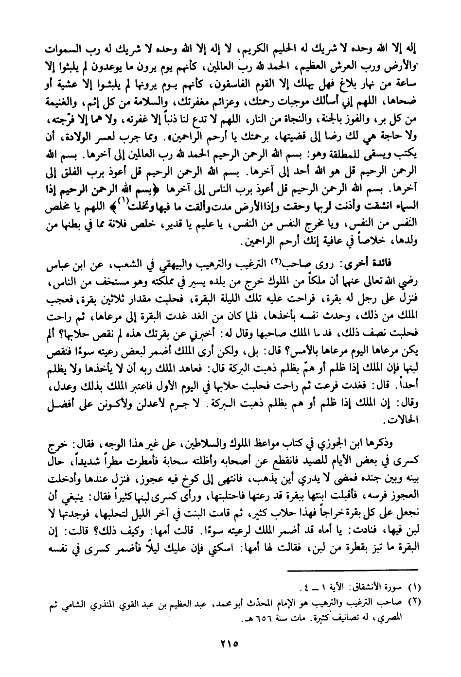إله إلا الله وحده لا شريك له الحليم الكريم، لا إله إلا الله وحده لا شريك له رب السموات والأرض ورب العرش العظيم، الحمد لله رب العالمين، كأنهم يوم يرون ما يوعدون لم يلبثوا إلا ساعة من نهار بلاغ فهل يهلك إلا القوم الفاسقون، كأنهم يوم يرونها لم يلبثوا إلا عشية أو ضحاها، اللهم إني أسألك موجبات رحمتك، وعزائم مغفرتك، والسلامة من كل إثم، والغنيمة من كل بر، والفوز بالجنة، والنجاة من النار، اللهم لا تدع لنا ذنبا إلا غفرته، ولا هما إلا فرّجته، ولا حاجة هي لك رضا إلى قضيتها، برحمتك يا أرحم الراحمين» . ومما جرب لعسر الولادة، أن يكتب ويسقى للمطلقة وهو: بسم الله الرحمن الرحيم الحمد لله رب العالمين إلى آخرها. بسم الله الرحمن الرحيم قل هو الله أحد إلى آخرها. بسم الله الرحمن الرحيم قل أعوذ برب الفلق إلى آخرها. بسم الله الرحمن الرحيم قل أعوذ برب الناس إلى آخرها بِسْمِ اللَّهِ الرَّحْمنِ الرَّحِيمِ إِذَا السَّماءُ انْشَقَّتْ وَأَذِنَتْ لِرَبِّها وَحُقَّتْ وَإِذَا الْأَرْضُ مُدَّتْ وَأَلْقَتْ ما فِيها وَتَخَلَّتْ «1»