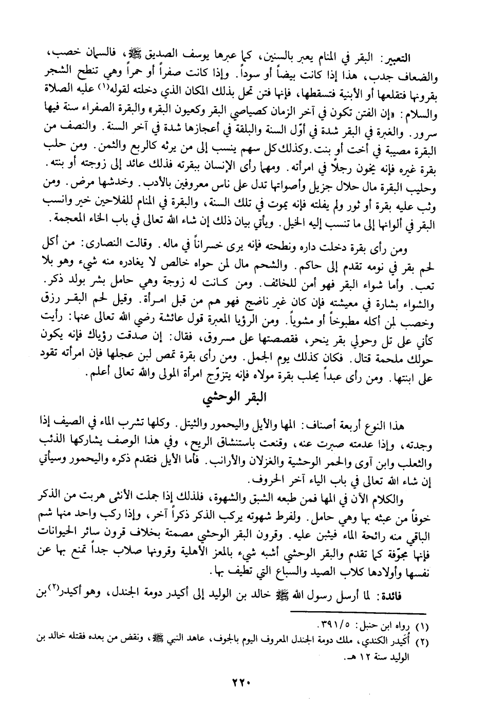 البقر في المنام يعبر بالسنين، كما عبرها يوسف الصديق صلى الله عليه وسلم، فالسمان خصب، والضعاف جدب، هذا إذا كانت بيضا أو سودا. وإذا كانت صفرا أو حمرا وهي تنطح الشجر بقرونها فتقلعها أو الأبنية فتسقطها، فإنها فتن تحل بذلك المكان الذي دخلته لقوله «1» عليه الصلاة والسلام: «إن الفتن تكون في آخر الزمان كصياصي البقر وكعيون البقر» والبقرة الصفراء سنة فيها سرور. والغبرة في البقر شدة في أوّل السنة والبلقة في أعجازها شدة في آخر السنة. والنصف من البقرة مصيبة في أخت أو بنت. وكذلك كل سهم ينسب إلى من يرثه كالربع والثمن. ومن حلب بقرة غيره فإنه يخون رجلا في امرأته. ومهما رأى الإنسان ببقرته فذلك عائد إلى زوجته أو بنته.