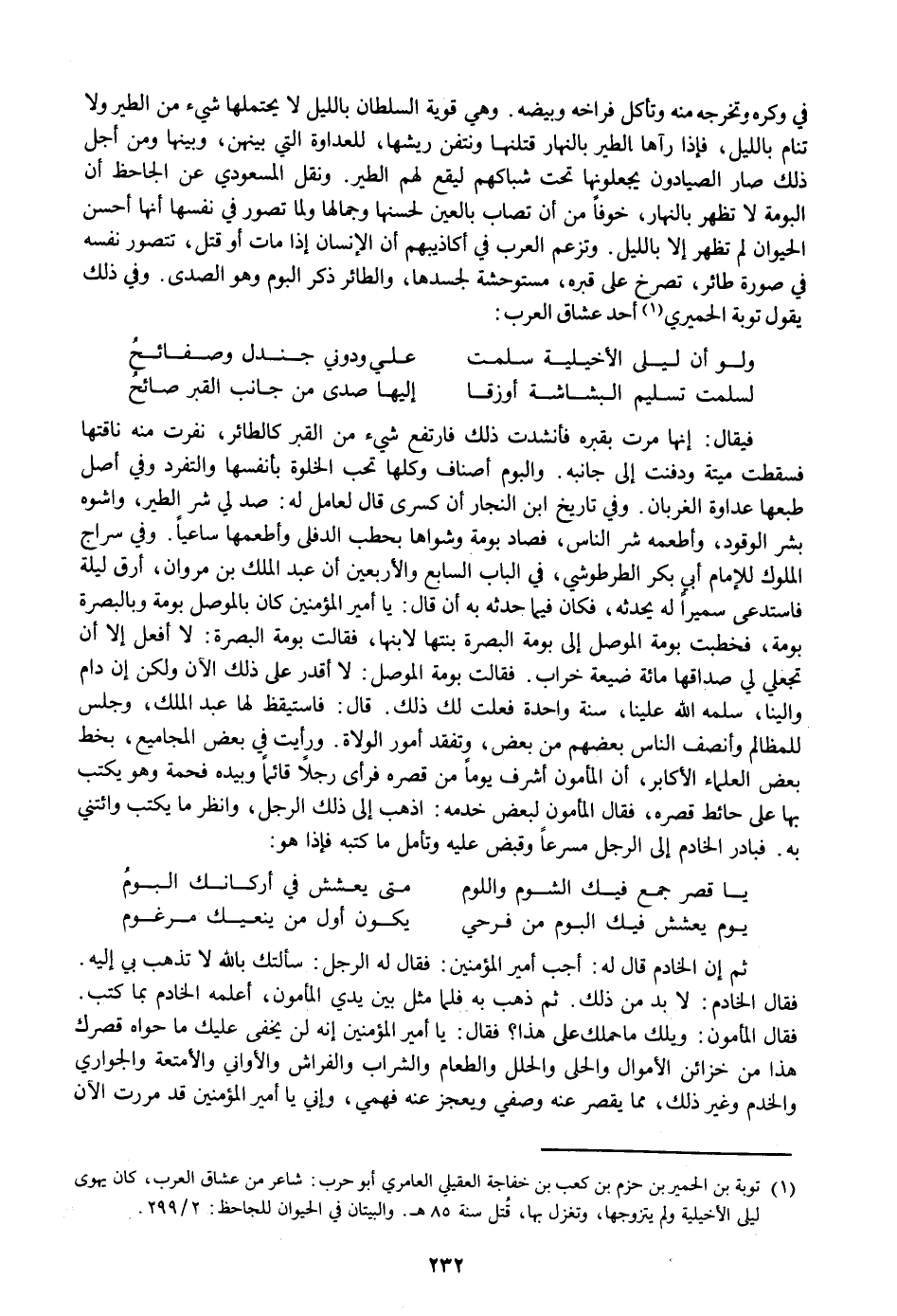فيقال: إنها مرت بقبره فأنشدت ذلك فارتفع شيء من القبر كالطائر، نفرت منه ناقتها فسقطت ميتة ودفنت إلى جانبه. والبوم أصناف وكلها تحب الخلوة بأنفسها والتفرد وفي أصل طبعها عداوة الغربان. وفي تاريخ ابن النجار أن كسرى قال لعامل له: صد لي شر الطير، واشوه بشر الوقود، وأطعمه شر الناس، فصاد بومة وشواها بحطب الدفلى وأطعمها ساعيا. وفي سراج الملوك للإمام أبي بكر الطرطوشي، في الباب السابع والأربعين أن عبد الملك بن مروان، أرق ليلة فاستدعى سميرا له يحدثه، فكان فيما حدثه به أن قال: يا أمير المؤمنين كان بالموصل بومة وبالبصرة بومة، فخطبت بومة الموصل إلى بومة البصرة بنتها لابنها، فقالت بومة البصرة: لا أفعل إلا أن تجعلي لي صداقها مائة ضيعة خراب. فقالت بومة الموصل: لا أقدر على ذلك الآن ولكن إن دام والينا، سلمه الله علينا، سنة واحدة فعلت لك ذلك. قال: فاستيقظ لها عبد الملك، وجلس للمظالم وأنصف الناس بعضهم من بعض، وتفقد أمور الولاة. ورأيت في بعض المجاميع، بخط بعض العلماء الأكابر، أن المأمون أشرف يوما من قصره فرأى رجلا قائما وبيده فحمة وهو يكتب بها على حائط قصره، فقال المأمون لبعض خدمه: اذهب إلى ذلك الرجل، وانظر ما يكتب وائتني به. فبادر الخادم إلى الرجل مسرعا وقبض عليه وتأمل ما كتبه فإذا هو: