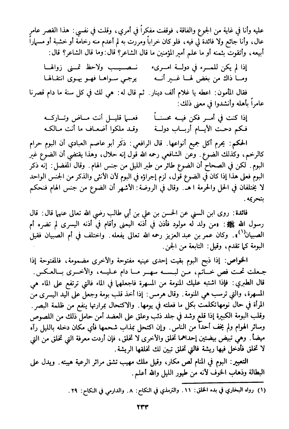عليه وأنا في غاية من الجوع والفاقة، فوقفت مفكرا في أمري، وقلت في نفسي: هذا القصر عامر عال، وأنا جائع ولا فائدة لي فيه، فلو كان خرابا ومررت به لم أعدم منه رخامة أو خشبة أو مسمارا أبيعه، وأتقوت بثمنه أو ما علم أمير المؤمنين ما قال الشاعر؟ قال: وما قال الشاعر؟ قال: