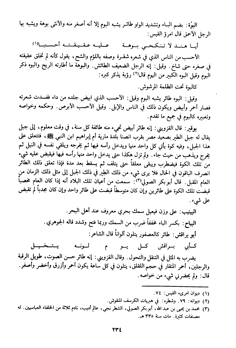 بضم الباء وتشديد الواو طائر يشبه البوم إلا أنه أصغر منه والأنثى بوهة ويشبه بها الرجل الأحمق قال امرؤ القيس: