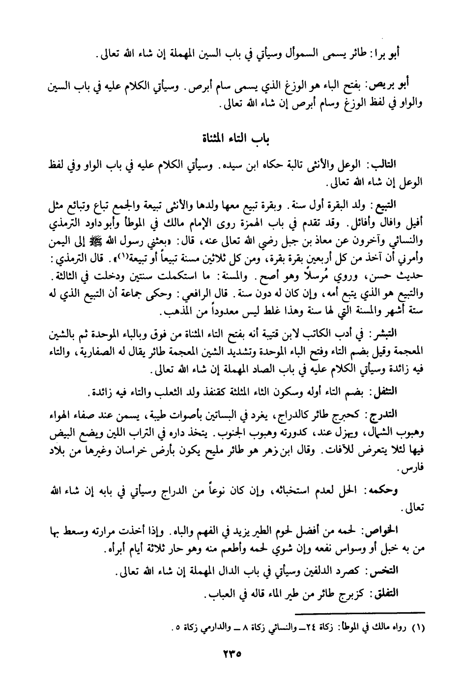 : في أدب الكاتب لابن قتيبة أنه بفتح التاء المثناة من فوق وبالباء الموحدة ثم بالشين المعجمة وقيل بضم التاء وفتح الباء الموحدة وتشديد الشين المعجمة طائر يقال له الصفارية، والتاء فيه زائدة وسيأتي الكلام عليه في باب الصاد المهملة إن شاء الله تعالى.