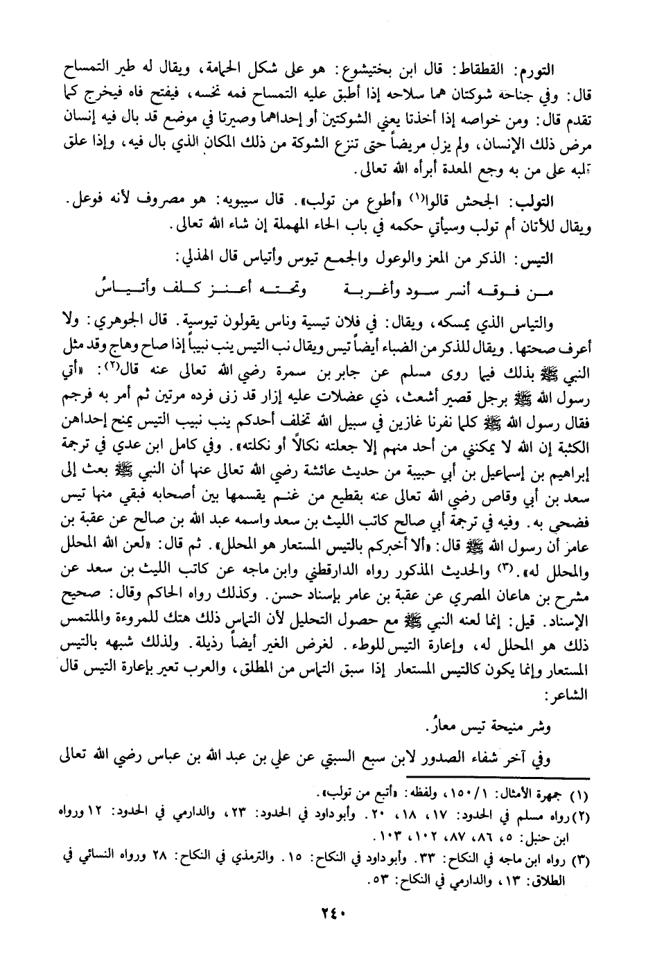 والتياس الذي يمسكه، ويقال: في فلان تيسية وناس يقولون تيوسية. قال الجوهري: ولا أعرف صحتها. ويقال للذكر من الضباء أيضا تيس ويقال نب التيس ينب نبيبا إذا صاح وهاج وقد مثل النبي صلى الله عليه وسلم بذلك فيما روى مسلم عن جابر بن سمرة رضي الله تعالى عنه قال «2» : «أتي رسول الله صلى الله عليه وسلم برجل قصير أشعث، ذي عضلات عليه إزار قد زنى فرده مرتين ثم أمر به فرجم فقال رسول الله صلى الله عليه وسلم كلما نفرنا غازين في سبيل الله تخلف أحدكم ينب نبيب التيس يمنح إحداهن الكثبة إن الله لا يمكنني من أحد منهم إلا جعلته نكالا أو نكلته» . وفي كامل ابن عدي في ترجمة إبراهيم بن إسماعيل بن أبي حبيبة من حديث عائشة رضي الله تعالى عنها أن النبي صلى الله عليه وسلم بعث إلى سعد بن أبي وقاص رضي الله تعالى عنه بقطيع من غنم يقسمها بين أصحابه فبقي منها تيس فضحى به. وفيه في ترجمة أبي صالح كاتب الليث بن سعد واسمه عبد الله بن صالح عن عقبة بن عامر أن رسول الله صلى الله عليه وسلم قال: «ألا أخبركم بالتيس المستعار هو المحلل» . ثم قال: «لعن الله المحلل والمحلل له» . «3» والحديث المذكور رواه الدارقطني وابن ماجه عن كاتب الليث بن سعد عن مشرح بن هاعان المصري عن عقبة بن عامر بإسناد حسن. وكذلك رواه الحاكم وقال: صحيح الإسناد. قيل: إنما لعنه النبي صلى الله عليه وسلم مع حصول التحليل لأن التماس ذلك هتك للمروءة والملتمس ذلك هو المحلل له، وإعارة التيس للوطء. لغرض الغير أيضا رذيلة. ولذلك شبهه بالتيس المستعار وإنما يكون كالتيس المستعار إذا سبق التماس من المطلق، والعرب تعير بإعارة التيس قال الشاعر: