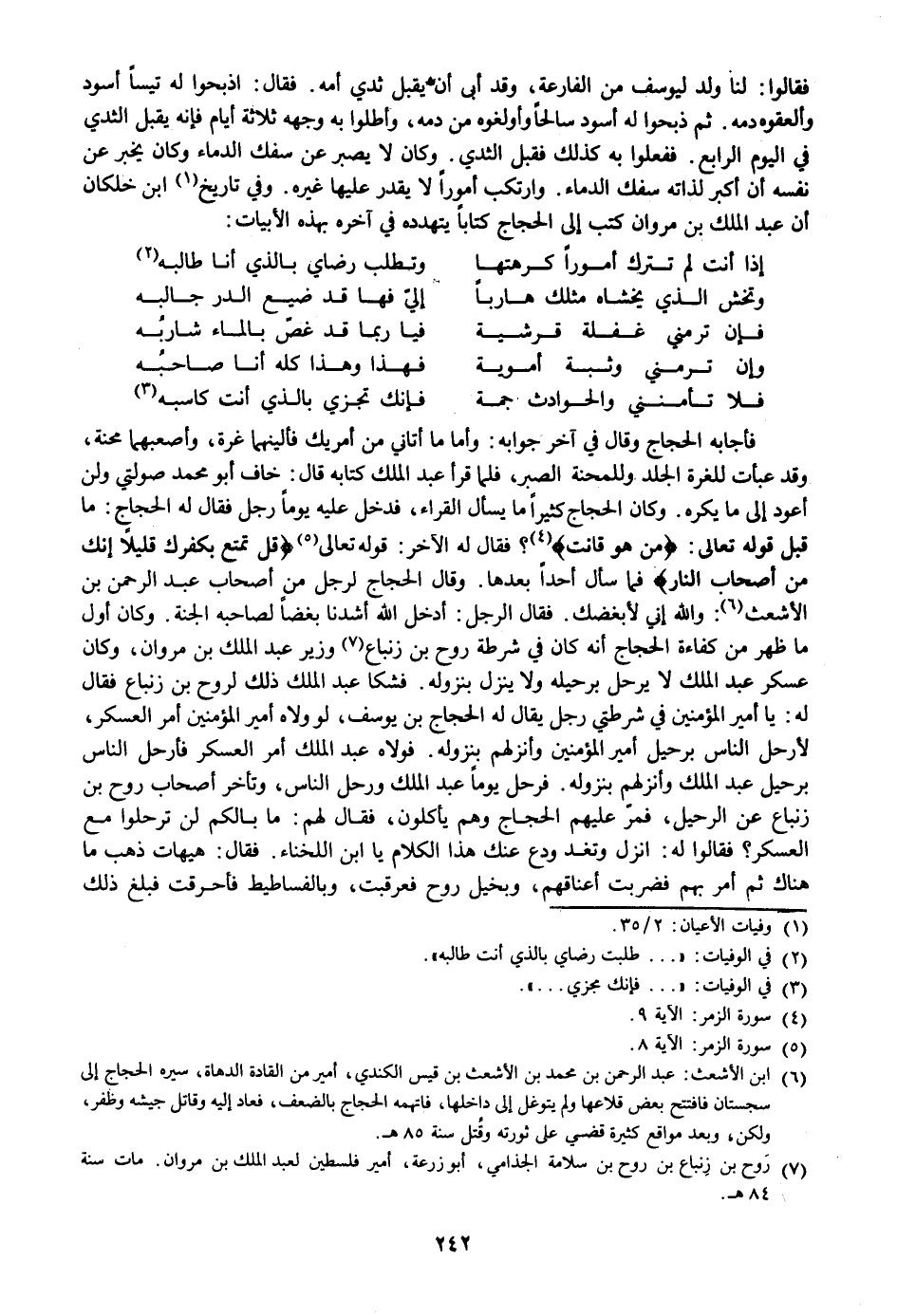 فقالوا: لنا ولد ليوسف من الفارعة، وقد أبى أن يقبل ثدي أمه. فقال: اذبحوا له تيسا أسود وألعقوه دمه. ثم ذبحوا له أسود سالحا وأولغوه من دمه، وأطلوا به وجهه ثلاثة أيام فإنه يقبل الثدي في اليوم الرابع. ففعلوا به كذلك فقبل الثدي. وكان لا يصبر عن سفك الدماء وكان يخبر عن نفسه أن أكبر لذاته سفك الدماء. وارتكب أمورا لا يقدر عليها غيره. وفي تاريخ «1» ابن خلكان أن عبد الملك بن مروان كتب إلى الحجاج كتابا يتهدده في آخره بهذه الأبيات: