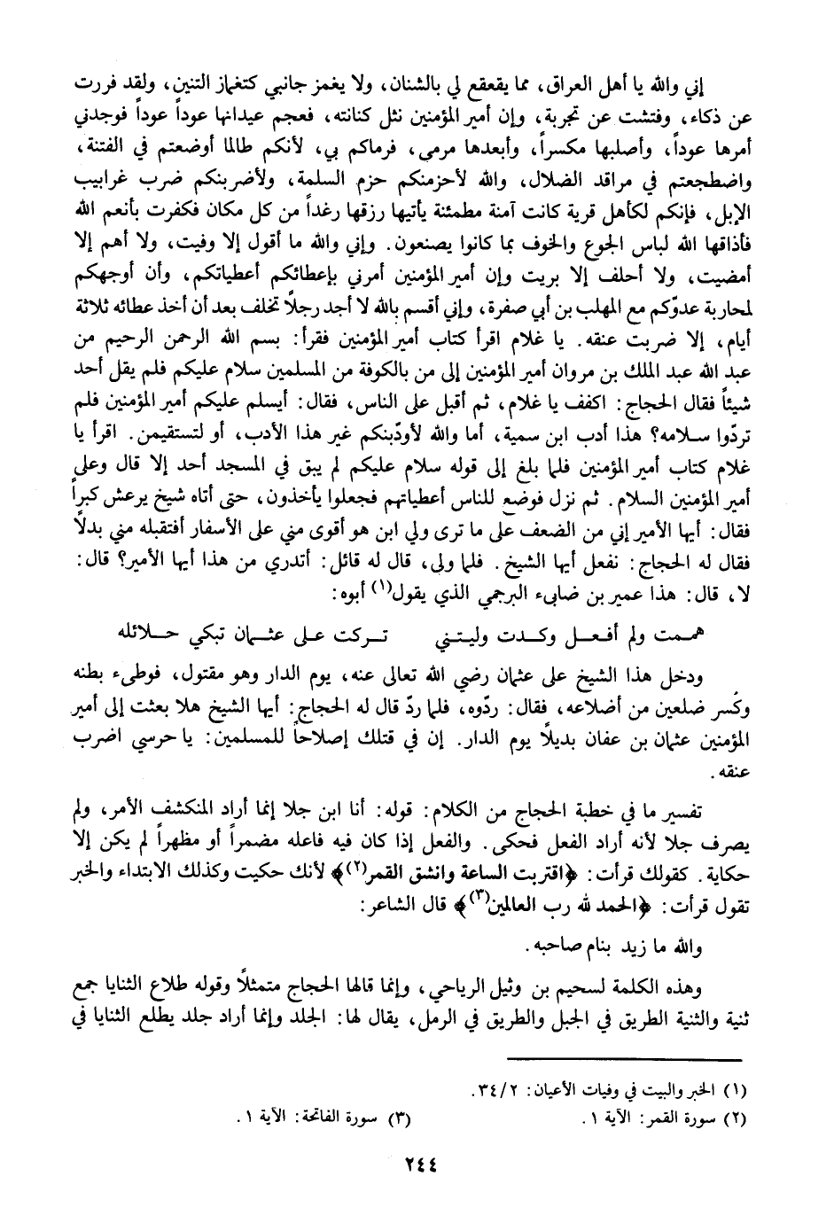 تفسير ما في خطبة الحجاج من الكلام: قوله: أنا ابن جلا إنما أراد المنكشف الأمر، ولم يصرف جلا لأنه أراد الفعل فحكى. والفعل إذا كان فيه فاعله مضمرا أو مظهرا لم يكن إلا حكاية. كقولك قرأت: اقْتَرَبَتِ السَّاعَةُ وَانْشَقَّ الْقَمَرُ «2»