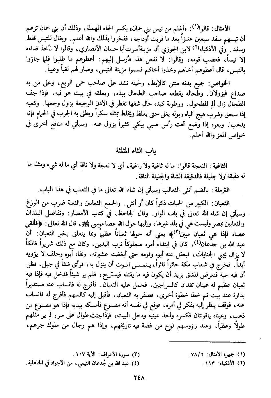 قالوا «1» : «أغلم من تيس بني حمان» بكسر الحاء المهملة، وذلك أن بني حمان تزعم أن تيسهم سفد سبعين عنزا بعد ما فريت أوداجه، ففخروا بذلك والله أعلم. ويقال للتيس قفط وسفد. وفي الأذكياء «2» لابن الجوزي أن مزينة أسرت أبا حسان الأنصاري، وقالوا لا نأخذ فداءه إلا تيسا، فغضب قومه، وقالوا: لا نفعل هذا فأرسل إليهم: أعطوهم ما طلبوا فلما جاؤوا بالتيس، قال أعطوهم أخاهم وخذوا أخاكم فسموا مزينة التيس، وصار لهم لقبا وعيبا.
