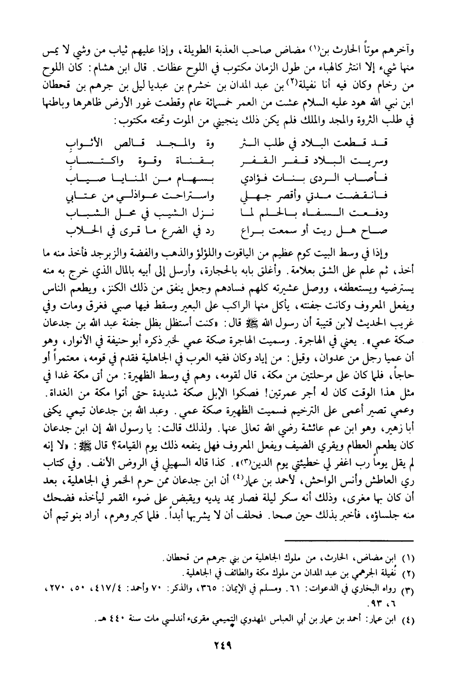 وعمي تصير أعمى على الترخيم فسميت الظهيرة صكة عمي. وعبد الله بن جدعان تيمي يكنى أبا زهير، وهو ابن عم عائشة رضي الله تعالى عنها. ولذلك قالت: يا رسول الله إن ابن جدعان كان يطعم العطام ويقري الضيف ويفعل المعروف فهل ينفعه ذلك يوم القيامة؟ قال صلى الله عليه وسلم: «لا إنه لم يقل يوما رب اغفر لي خطيئتي يوم الدين «3» » . كذا قاله السهيلي في الروض الأنف. وفي كتاب ري العاطش وأنس الواحش، لأحمد بن عمار «4» أن ابن جدعان ممن حرم الخمر في الجاهلية، بعد أن كان بها مغرى، وذلك أنه سكر ليلة فصار يمد يديه ويقبض على ضوء القمر ليأخذه فضحك منه جلساؤه، فأخبر بذلك حين صحا. فحلف أن لا يشربها أبدا. فلما كبر وهرم، أراد بنو تيم أن