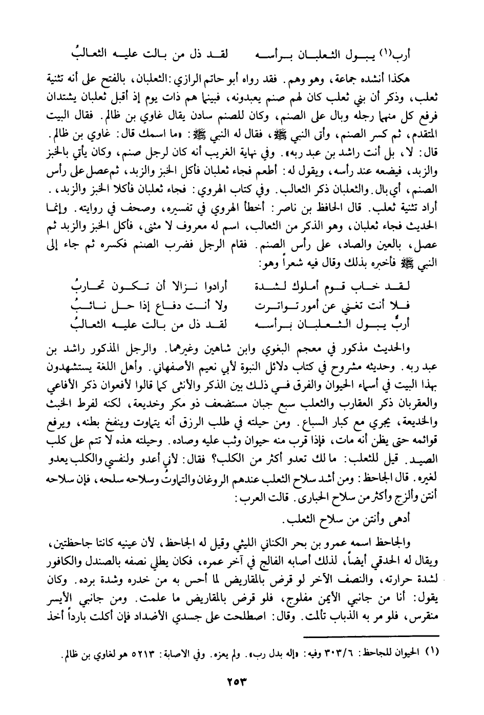 هكذا أنشده جماعة، وهو وهم. فقد رواه أبو حاتم الرازي: الثعلبان، بالفتح على أنه تثنية ثعلب، وذكر أن بني ثعلب كان لهم صنم يعبدونه، فبينما هم ذات يوم إذ أقبل ثعلبان يشتدان فرفع كل منهما رجله وبال على الصنم، وكان للصنم سادن يقال غاوي بن ظالم. فقال البيت المتقدم، ثم كسر الصنم، وأتى النبي صلى الله عليه وسلم، فقال له النبي صلى الله عليه وسلم: «ما اسمك قال: غاوي بن ظالم.