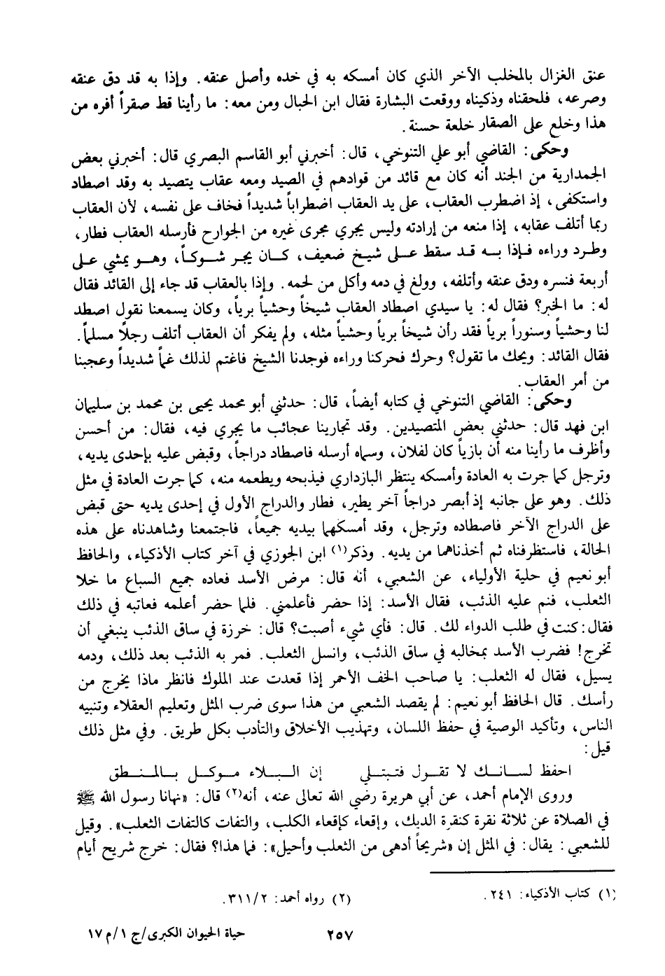 وحكى: القاضي التنوخي في كتابه أيضا، قال: حدثني أبو محمد يحيى بن محمد بن سليمان ابن فهد قال: حدثني بعض المتصيدين. وقد تجارينا عجائب ما يجري فيه، فقال: من أحسن وأظرف ما رأينا منه أن بازيا كان لفلان، وسماه أرسله فاصطاد دراجا، وقبض عليه بإحدى يديه، وترجل كما جرت به العادة وأمسكه ينتظر البازداري فيذبحه ويطعمه منه، كما جرت العادة في مثل ذلك. وهو على جانبه إذ أبصر دراجا آخر يطير، فطار والدراج الأول في إحدى يديه حتى قبض على الدراج الآخر فاصطاده وترجل، وقد أمسكهما بيديه جميعا، فاجتمعنا وشاهدناه على هذه الحالة، فاستظرفناه ثم أخذناهما من يديه. وذكر «1» ابن الجوزي في آخر كتاب الأذكياء، والحافظ أبو نعيم في حلية الأولياء، عن الشعبي، أنه قال: مرض الأسد فعاده جميع السباع ما خلا الثعلب، فنم عليه الذئب، فقال الأسد: إذا حضر فأعلمني. فلما حضر أعلمه فعاتبه في ذلك فقال: كنت في طلب الدواء لك. قال: فأي شيء أصبت؟ قال: خرزة في ساق الذئب ينبغي أن تخرج! فضرب الأسد بمخالبه في ساق الذئب، وانسل الثعلب. فمر به الذئب بعد ذلك، ودمه يسيل، فقال له الثعلب: يا صاحب الخف الأحمر إذا قعدت عند الملوك فانظر ماذا يخرج من رأسك. قال الحافظ أبو نعيم: لم يقصد الشعبي، من هذا سوى ضرب المثل وتعليم العقلاء وتنبيه الناس، وتأكيد الوصية في حفظ اللسان، وتهذيب الأخلاق والتأدب بكل طريق. وفي مثل ذلك قيل: