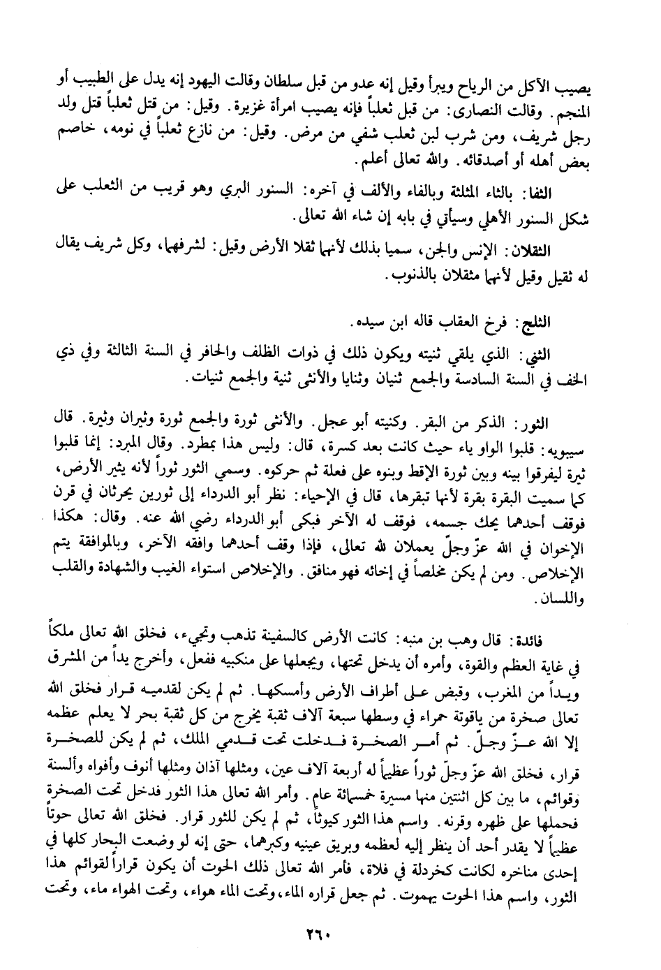 الذكر من البقر. وكنيته أبو عجل. والأنثى ثورة والجمع ثورة وثيران وثيرة. قال سيبويه: قلبوا الواو ياء حيث كانت بعد كسرة، قال: وليس هذا بمطرد. وقال المبرد: إنما قلبوا ثيرة ليفرقوا بينه وبين ثورة الإقط وبنوه على فعلة ثم حركوه. وسمي الثور ثورا لأنه يثير الأرض، كما سميت البقرة بقرة لأنها تبقرها، قال في الإحياء: نظر أبو الدرداء إلى ثورين يحرثان في قرن فوقف أحدهما يحك جسمه، فوقف له الآخر فبكى أبو الدرداء رضي الله عنه. وقال: هكذا الإخوان في الله عزّ وجلّ يعملان لله تعالى، فإذا وقف أحدهما وافقه الآخر، وبالموافقة يتم الإخلاص. ومن لم يكن مخلصا في إخائه فهو منافق. والإخلاص استواء الغيب والشهادة والقلب واللسان.