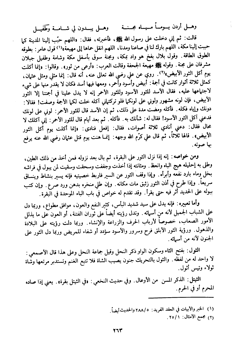 قالت: ثم إني دخلت على رسول الله صلى الله عليه وسلم، فأخبرته، فقال: «اللهم حبّب إلينا المدينة كما حببت إلينا مكة، اللهم بارك لنا في صاعنا ومدنا، اللهم انقل حماها إلى مهيعة» «1» قول عامر: بطوقه الطوق الطاقة. وقول بلال بفخ هو واد بمكة، ومجنة سوق بأسفل مكة وشامة وطفيل جبلان مشرفان على مجنة. وقوله صلى الله عليه وسلم مهيعة الجحفة وقالت العرب: «أرعى من ثور» . وقالوا: «إنما أكلت يوم أكل الثور الأبيض» «2» . روي عن علي رضي الله تعالى عنه، أنه قال: إنما مثلي ومثل عثمان، كمثل ثلاثة أثوار كانت في أجمة: أبيض وأسود وأحمر، ومعها فيها أسد فكان لا يقدر منها على شيء لاجتماعها عليه، فقال الأسد للثور الأسود وللثور الأحمر إنه لا يدل علينا في أجمتنا إلا الثور الأبيض، فإن لونه مشهور ولوني على لونكما فلو تركتماني آكله خلت لكما الأجمة وصفت! فقالا: