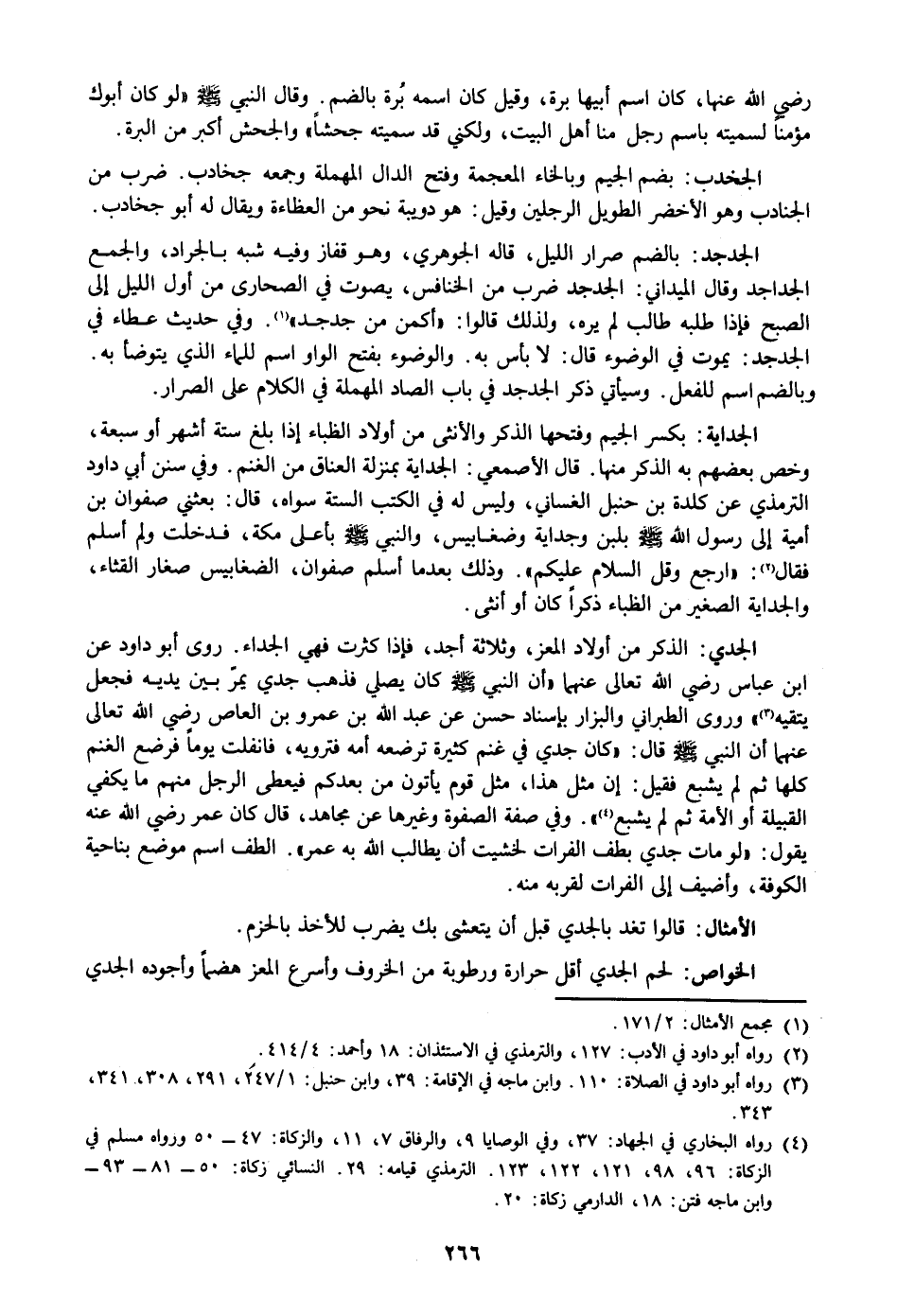 الذكر من أولاد المعز، وثلاثة أجد، فإذا كثرت فهي الجداء. روى أبو داود عن ابن عباس رضي الله تعالى عنهما «أن النبي صلى الله عليه وسلم كان يصلي فذهب جدي يمرّ بين يديه فجعل يتقيه «3» » وروى الطبراني والبزار بإسناد حسن عن عبد الله بن عمرو بن العاص رضي الله تعالى عنهما أن النبي صلى الله عليه وسلم قال: «كان جدي في غنم كثيرة ترضعه أمه فترويه، فانفلت يوما فرضع الغنم كلها ثم لم يشبع فقيل: إن مثل هذا، مثل قوم يأتون من بعدكم فيعطى الرجل منهم ما يكفي القبيلة أو الأمة ثم لم يشبع «4» » . وفي صفة الصفوة وغيرها عن مجاهد، قال كان عمر رضي الله عنه يقول: «لو مات جدي بطف الفرات لخشيت أن يطالب الله به عمر» . الطف اسم موضع بناحية الكوفة، وأضيف إلى الفرات لقربه منه.