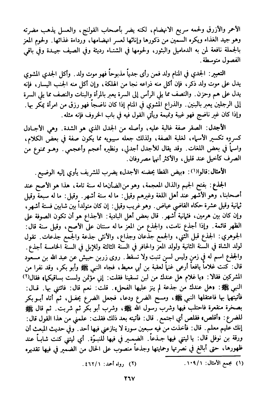 الأحمر والأزرق ولحمه سريع الانهضام، لكنه يضر بأصحاب القولنج، والعسل يذهب مضرته وهو جيد الغذاء ويكره السمين من ذكورها وإناثها لعسر انهضامها، ورداءة غذائها. ولحوم المعز بالجملة نافعة لمن به الدماميل والبثور، ولحومها في الشتاء رديئة وفي الصيف جيدة وفي باقي الفصول متوسطة.