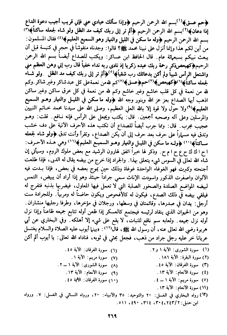 «9» ولا حول ولا قوة إلا بالله العلي العظيم، وصلى الله على سيدنا محمد خاتم النبيين والمرسلين وعلى آله وصحبه أجمعين. قال: يكتب ويجعل على الرأس فإنه نافع. قلت: وهو عجيب مجرب. قال: ومما جرب أيضا للصداع أن تكتب هذه الأحرف الآتية على دف خشب وتدق فيه مسمارا على حرف بعد حرف إلى أن يكن الصداع، وتقرأ وأنت تدق وَلَوْ شاءَ لَجَعَلَهُ ساكِناً