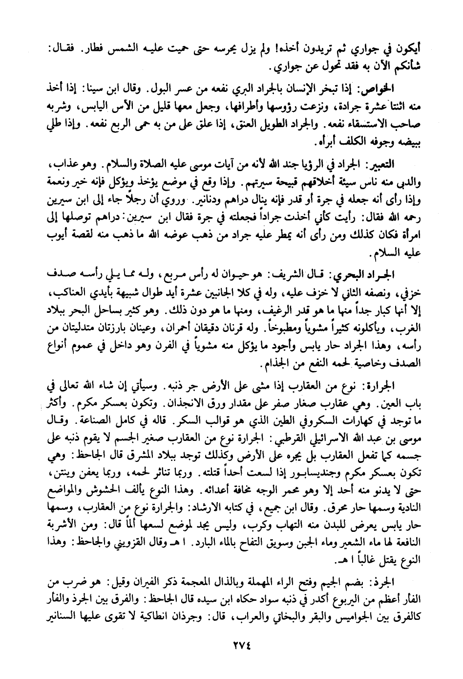 قال الشريف: هو حيوان له رأس مربع، وله مما يلي رأسه صدف خزفي، ونصفه الثاني لا خزف عليه، وله في كلا الجانبين عشرة أيد طوال شبيهة بأيدي العناكب، إلا أنها كبار جدا منها ما هو قدر الرغيف، ومنها ما هو دون ذلك. وهو كثير بساحل البحر ببلاد الغرب، ويأكلونه كثيرا مشويا ومطبوخا. وله قرنان دقيقان أحمران، وعينان بارزتان متدليتان من رأسه، وهذا الجراد حار يابس وأجود ما يؤكل منه مشويا في الفرن وهو داخل في عموم أنواع الصدف وخاصية لحمه النفع من الجذام.