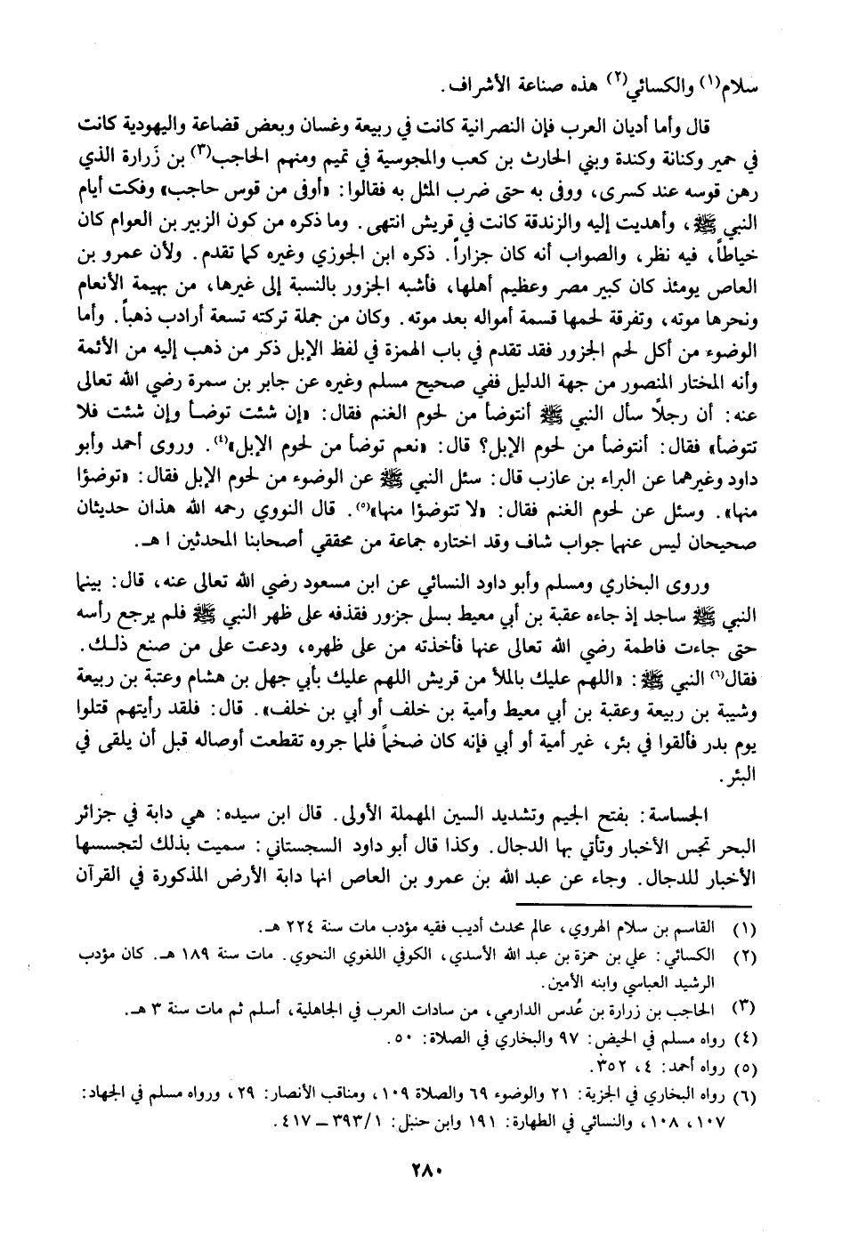 قال وأما أديان العرب فإن النصرانية كانت في ربيعة وغسان وبعض قضاعة واليهودية كانت في حمير وكنانة وكندة وبني الحارث بن كعب والمجوسية في تميم ومنهم الحاجب «3» بن زرارة الذي رهن قوسه عند كسرى، ووفى به حتى ضرب المثل به فقالوا: «أوفى من قوس حاجب» وفكت أيام النبي صلى الله عليه وسلم، وأهديت إليه والزندقة كانت في قريش انتهى. وما ذكره من كون الزبير بن العوام كان خياطا، فيه نظر، والصواب أنه كان جزارا. ذكره ابن الجوزي وغيره كما تقدم. ولأن عمرو بن العاص يومئذ كان كبير مصر وعظيم أهلها، فأشبه الجزور بالنسبة إلى غيرها، من بهيمة الأنعام ونحرها موته، وتفرقة لحمها قسمة أمواله بعد موته. وكان من جملة تركته تسعة أرادب ذهبا. وأما الوضوء من أكل لحم الجزور فقد تقدم في باب الهمزة في لفظ الإبل ذكر من ذهب إليه من الأئمة وأنه المختار المنصور من جهة الدليل ففي صحيح مسلم وغيره عن جابر بن سمرة رضي الله تعالى عنه: أن رجلا سأل النبي صلى الله عليه وسلم أنتوضأ من لحوم الغنم فقال: «إن شئت توضأ وإن شئت فلا تتوضأ» فقال: أنتوضأ من لحوم الإبل؟ قال: «نعم توضأ من لحوم الإبل» «4» . وروى أحمد وأبو داود وغيرهما عن البراء بن عازب قال: سئل النبي صلى الله عليه وسلم عن الوضوء من لحوم الإبل فقال: «توضؤا منها» . وسئل عن لحوم الغنم فقال: «لا تتوضؤا منها» «5» . قال النووي رحمه الله هذان حديثان صحيحان ليس عنهما جواب شاف وقد اختاره جماعة من محققي أصحابنا المحدثين اهـ.