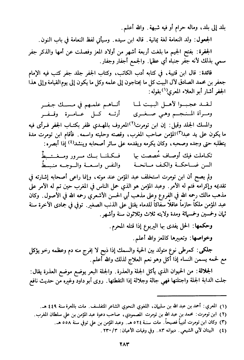 والمسك الجلد وقيل: إن ابن تومرت «2» المعروف بالمهدي ظفر بكتاب الجفر فرأى فيه ما يكون على يد عبد «3» المؤمن صاحب المغرب، وقصته وحليته واسمه. فأقام ابن تومرت مدة يتطلبه حتى وجده وصحبه، وكان يكرمه ويقدمه على سائر أصحابه وينشد «4» إذا أبصره: