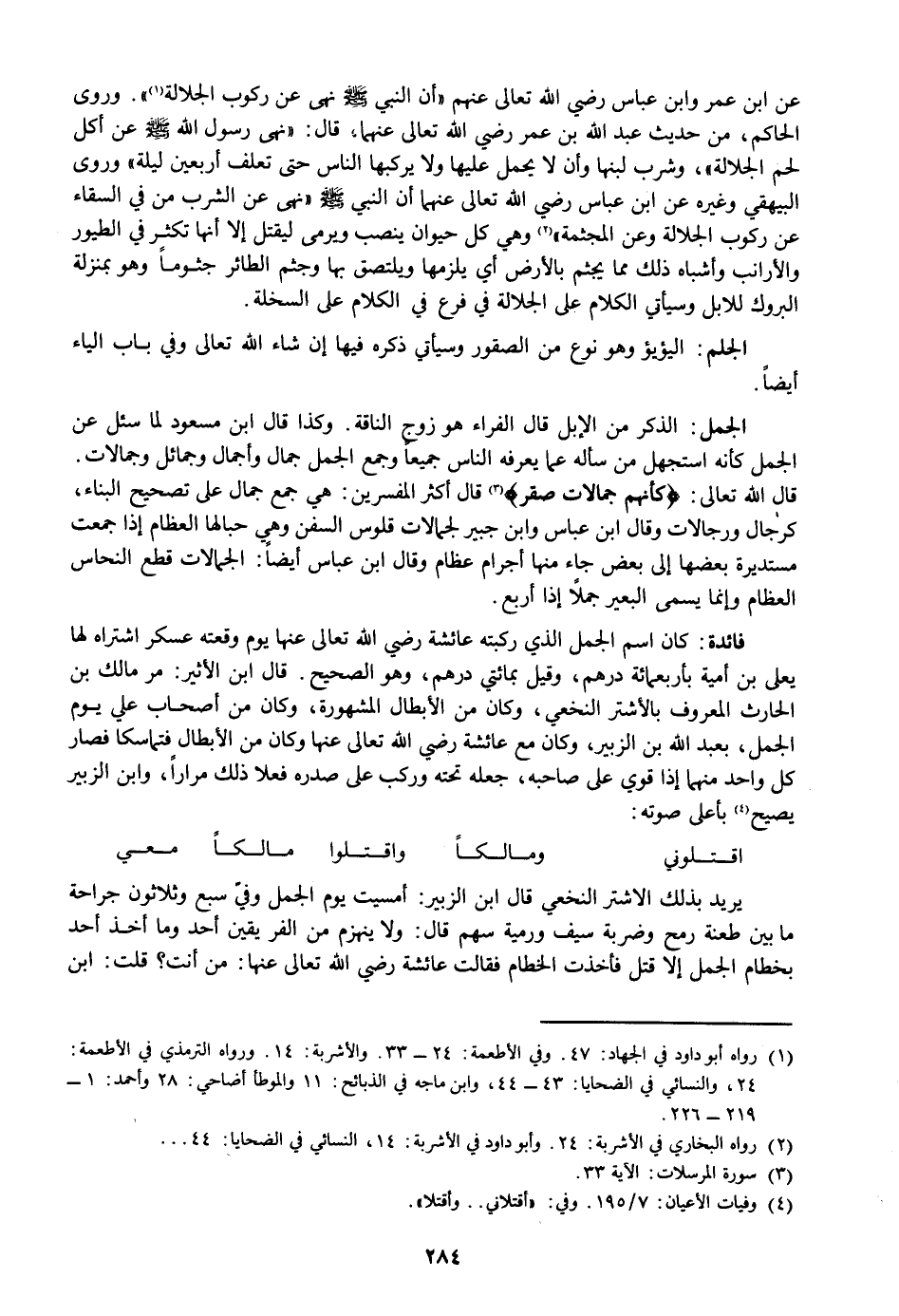 «3» قال أكثر المفسرين: هي جمع جمال على تصحيح البناء، كرجال ورجالات وقال ابن عباس وابن جبير لجمالات قلوس السفن وهي حبالها العظام إذا جمعت مستديرة بعضها إلى بعض جاء منها أجرام عظام وقال ابن عباس أيضا: الجمالات قطع النحاس العظام وإنما يسمى البعير جملا إذا أربع.