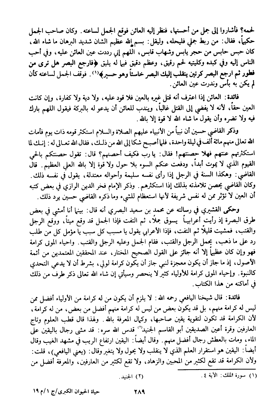 وحكى القشيري في رسالته عن محمد بن سعيد البصري أنه قال: بينما أنا أمشي في بعض طرق البصرة إذ رأيت أعرابيا يسوق جملا، ثم التفت فإذا الجمل قد وقع ميتا، ووقع الرجل والقتب، فمشيت قليلا ثم التفت، فإذا الأعرابي يقول يا مسبب كل سبب يا مؤمل كل من طلب رد على ما ذهب، يحمل الرجل والقتب، فقام الجمل وعليه الرجل والقتب. واحياء الموتى كرامة فهو وإن كان عظيما إلا أنه جائز على القول الصحيح المختار، عند المحققين المعتمدين من أئمة الأصول، إذ ما جاز أن يكون معجزة لنبي جاز أن يكون كرامة لولي، بشرط أن لا يدعي التحدي كالنبوة. وإحياء الموتى كرامة للأولياء كثير لا ينحصر وسيأتي إن شاء الله تعالى ذكر طرف من ذلك في أماكنه من هذا الكتاب.