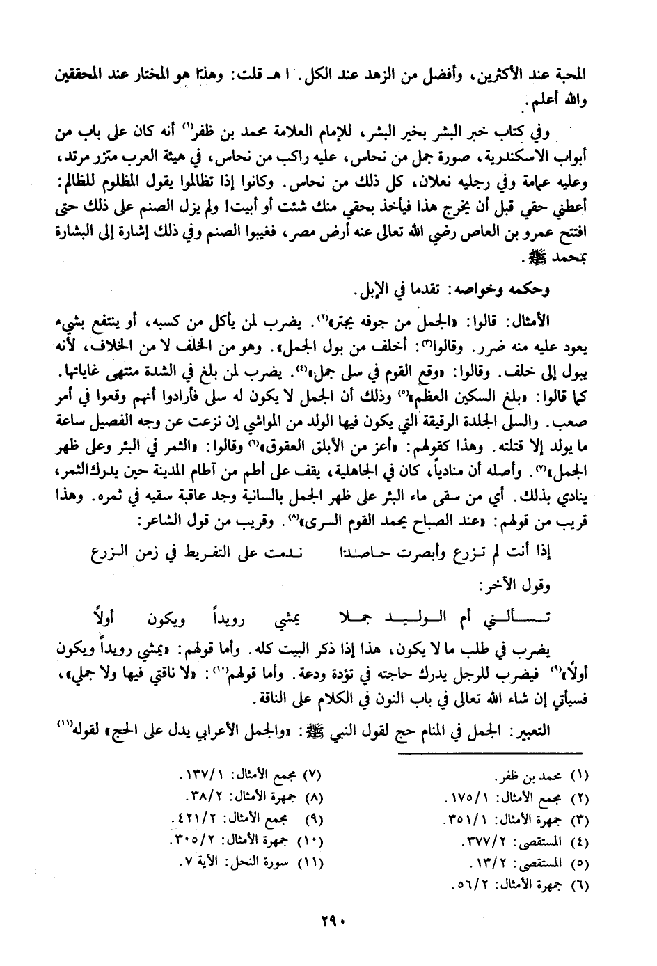 قالوا: «الجمل من جوفه يجتر» «2» . يضرب لمن يأكل من كسبه، أو ينتفع بشيء يعود عليه منه ضرر. وقالوا «3» : أخلف من بول الجمل» . وهو من الخلف لا من الخلاف، لأنه يبول إلى خلف. وقالوا: «وقع القوم في سلى جمل» «4» . يضرب لمن بلغ في الشدة منتهى غاياتها.
