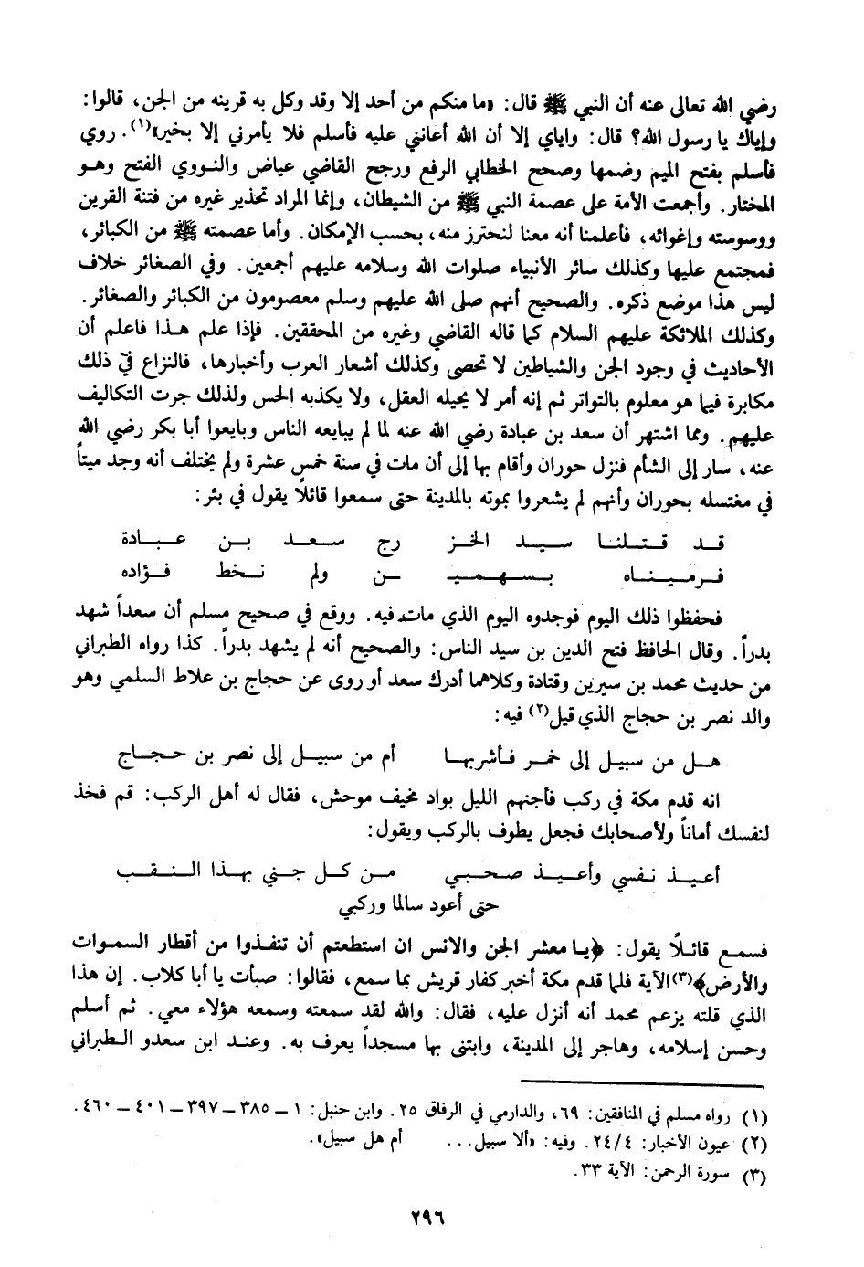 وكذلك الملائكة عليهم السلام كما قاله القاضي وغيره من المحققين. فإذا علم هذا فاعلم أن الأحاديث في وجود الجن والشياطين لا تحصى وكذلك أشعار العرب وأخبارها، فالنزاع في ذلك مكابرة فيما هو معلوم بالتواتر ثم إنه أمر لا يحيله العقل، ولا يكذبه الحس ولذلك جرت التكاليف عليهم. ومما اشتهر أن سعد بن عبادة رضي الله عنه لما لم يبايعه الناس وبايعوا أبا بكر رضي الله عنه، سار إلى الشأم فنزل حوران وأقام بها إلى أن مات في سنة خمس عشرة ولم يختلف أنه وجد ميتا في مغتسله بحوران وأنهم لم يشعروا بموته بالمدينة حتى سمعوا قائلا يقول في بئر: