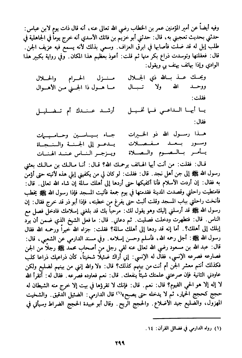 قال: فقلت: من أنت أيها الهاتف يرحمك الله؟ قال: أنا مالك بن مالك بعثني رسول الله صلى الله عليه وسلم إلى جن أهل نجد. قال: فقلت: لو كان لي من يكفيني إبلي هذه لأتيته حتى أؤمن به فقال: إن أردت الأسلام فأنا أكفيكها حتى أردها إلى أهلك سالمة إن شاء الله تعالى. قال: