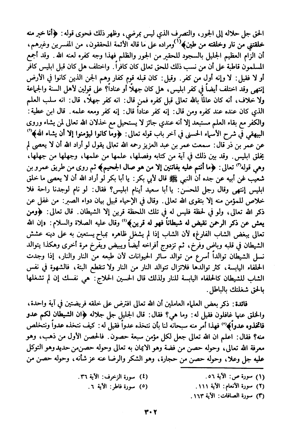 ثم روى من طريق عمرو بن شعيب عن أبيه عن جده أن النبي صلى الله عليه وسلم قال لأبي بكر: يا أبا بكر لو أراد الله أن لا يعصى ما خلق ابليس إنتهى وقال رجل للحسن: يا أبا سعيد أينام ابليس؟ فقال: لو نام لوجدنا راحة فلا خلاص للمؤمن منه إلا بتقوى الله تعالى. وقال في الإحياء قبيل بيان دواء الصبر: من غفل عن ذكر الله تعالى، ولو في لحظة فليس له في تلك اللحظة قرين إلا الشيطان. قال تعالى: وَمَنْ يَعْشُ عَنْ ذِكْرِ الرَّحْمنِ نُقَيِّضْ لَهُ شَيْطاناً فَهُوَ لَهُ قَرِينٌ