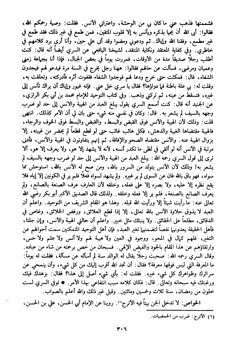 فشممتها فذهب عني ما كان بي من الوحشة، واعتراني الأنس. فقلت: وصية رحمكم الله، فقالوا: أبى الله أن يحيا بذكره ويأنس به إلا قلوب المتقين، فمن طمع في غير ذلك فقد طمع في غير مطمع، وفقنا الله وإياك. ثم ودعوني ومضوا وقد أتى علي حين، وأنا أرى برد كلامهم في خاطري. وفي كفاية المعتقد ونكاية المنتقد، لشيخنا اليافعي عن السري أيضا أنه قال: كنت أطلب رجلا صديقا مدة من الأوقات، فمررت يوما في بعض الجبال، فإذا أنا بجماعة زمنى وعميان ومرضى، فسألت عن حالهم فقالوا: ههنا رجل يخرج في السنة مرة فيدعو لهم فيجدون الشفاء، قال: فمكثت حتى خرج ودعا لهم فوجدوا الشفاء فقفوت أثره فأدركته، وتعلقت به، وقلت له: بي علة باطنة فما دواؤها؟ فقال يا سري خل عني. فإنه غيور وإياك أن يراك تأنس إلى غيره، فتسقط من عينه، ثم تركني وذهب. وفي كتاب التوحيد للإمام محمد بن أبي بكر الرازي، عن الجنيد أنه قال: كنت أسمع السري يقول يبلغ العبد من الهيبة والانس إلى حد لو ضرب وجهه بالسيف لم يشعر به. قال: وكان في نفسي منه شيء حتى بان لي أن الأمر كذلك. انتهى قلت: وذلك لأن الهيبة والأنس فوق القبض والبسط، والقبض والبسط فوق الخوف والرجاء، فالهيبة مقتضاها الغيبة والدهش، فكل هائب غائب حتى لو قطع قطعا لم يحضر من غيبته، إلا بزوال الهيبة عنه. والأنس مقتضاه الصحو والإفاقة، ثم إنهم يتفاوتون في الهيبة والأنس، فأدنى مرتبة في الأنس أنه لو ألقي في لظى ما تكدر أنسه، لأنه لا يشهد إلا هو، ولا يعرف إلا هو، ألا ترى إلى قول السري رحمه الله: يبلغ العبد من الهيبة والأنس إلى حد لو ضرب وجهه بالسيف لم يشعر به! وذلك لأن الأنس يتولد من السرور بالله، ومن صح له الأنس بالله، استوحش مما سواه، فهو باق بالله فان عن السوى لم ير غيره. ولم يشهد لسواه فعلا فلم ير في الكونين إلا إياه فلا يقع نظره إلا عليه، ولا بصره إلا على فعله، وخلقه لأن العارف عرف الصنعة بالصانع، ولم يعرف الصانع بالصنعة، فلم ير إلا فعله وخلقه. ولذلك قال الصديق الأكبر أبو بكر رضي الله تعالى عنه: ما رأيت شيئا إلا ورأيت الله قبله. وهذا هو المقام الشريف من التوحيد. واعلم أن العبد لا يذوق حلاوة الأنس بالله تعالى، إلا إذا قطع العلائق، ورفض الخلائق، وغاص في الدقائق، مطلعا على الحقائق. ولا ينبئك مثل خبير. واعلم أن حالتي الهيبة والأنس، وإن جلتا، فأهل الحقيقة يعدونهما نقصا لتضمنهما تغير العبد، فإن أهل التوحيد المتمكنين سمت أحوالهم عن التغير، فلهم كمال في المحو، ووجود في العين ولا هيبة لهم ولا أنس ولا علم ولا حس، وارتقاؤهم عن هذا المقام بالجود والفيض الإلهي. فسبحان من خص برحمته من شاء من عباده.